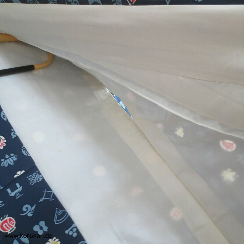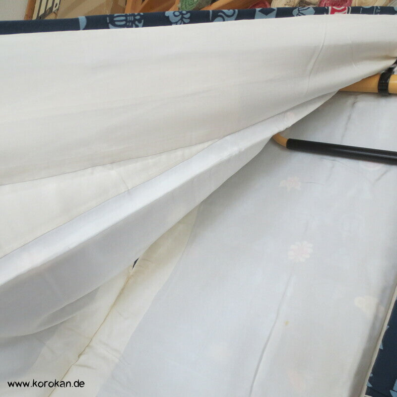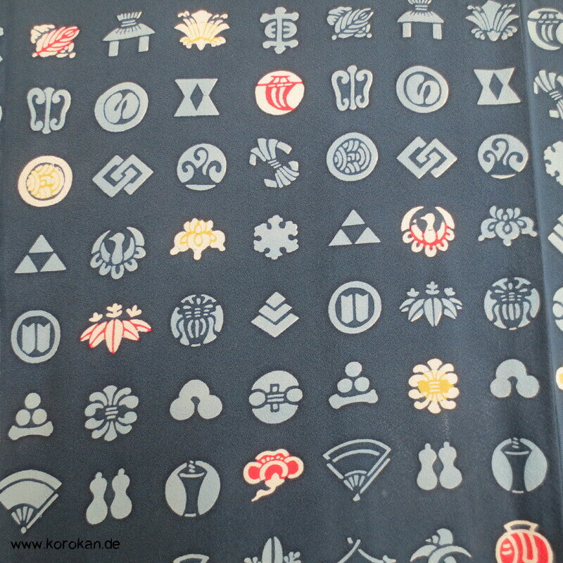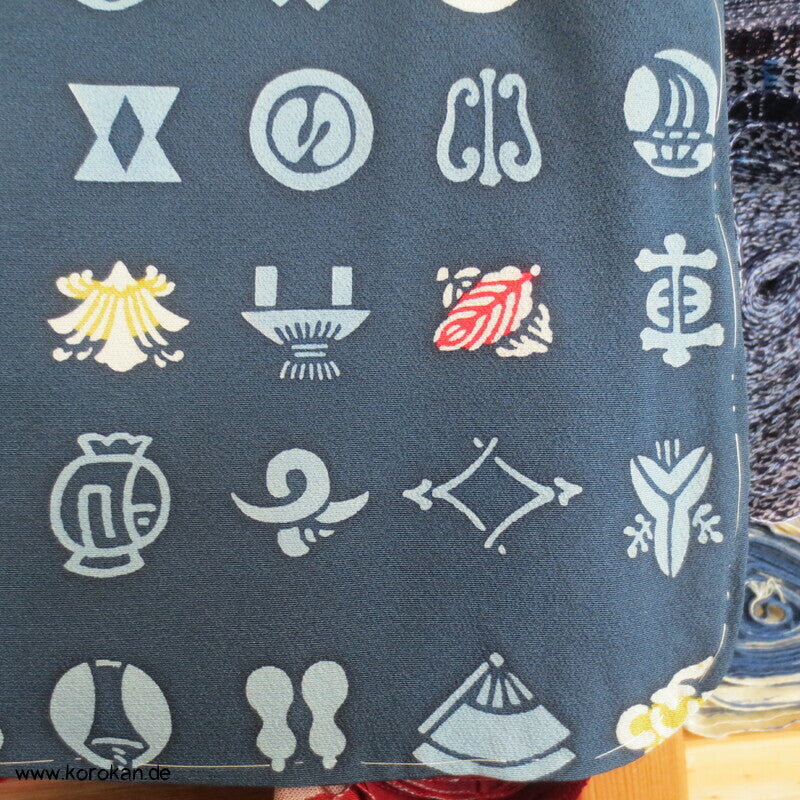 Vintage Komon Kimono Mon Druck auf mattem jeansblau, unteres Teilfutter rot. Seidencrepe, helles Seidenfutter oben