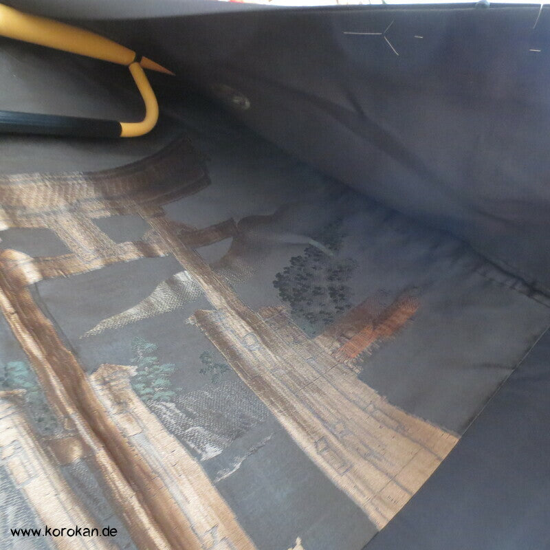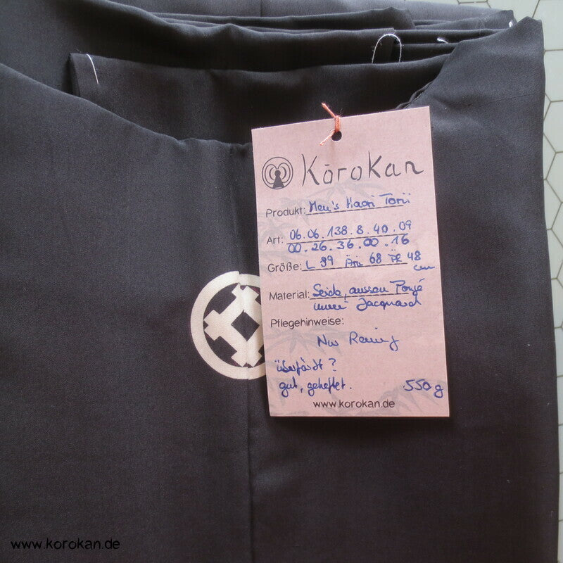 Vintage klassische Montsuki 5 Wappen Mon japanische Männer Haori aus schwarzem Seidencrepe mit bildgewebtem Jacquard Seidenfutter - super edel - Tempeltor