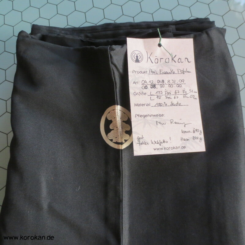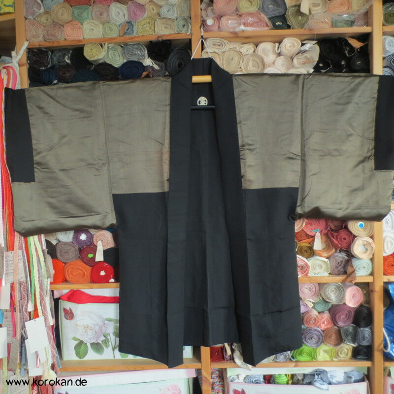 Vintage Set aus Kimono und Haori aus feiner schwarzer Crepe Seide mit formellen 3 Pinien Mon. Kimono mit hellem oberen und schwarzem unteren Seiden Futter, Haori mit gewebten Jacquard Seidenfutter 3 Bilder mit fliegenden Spatzen dazwischen