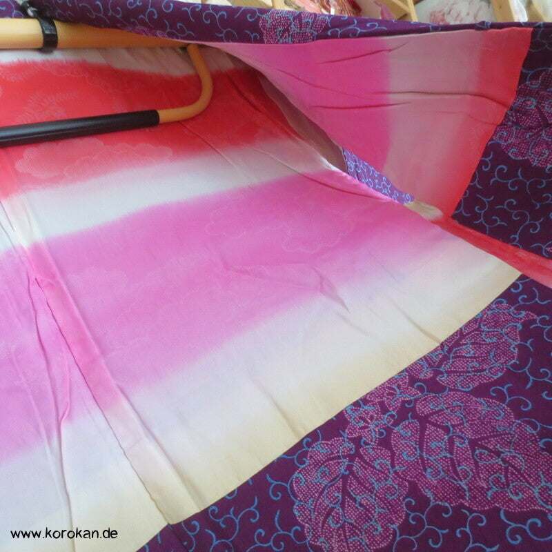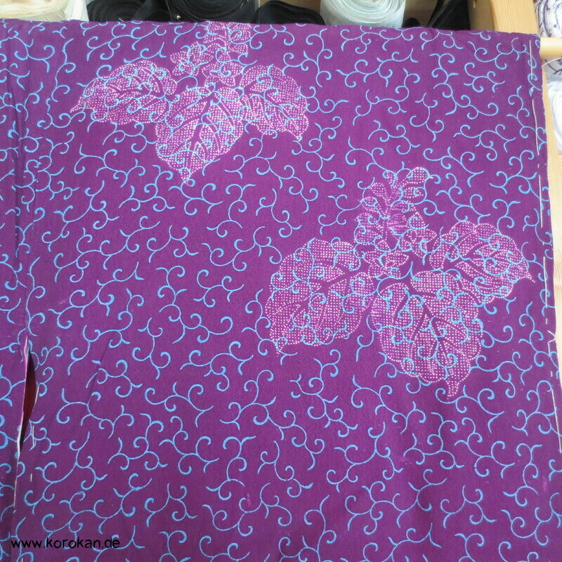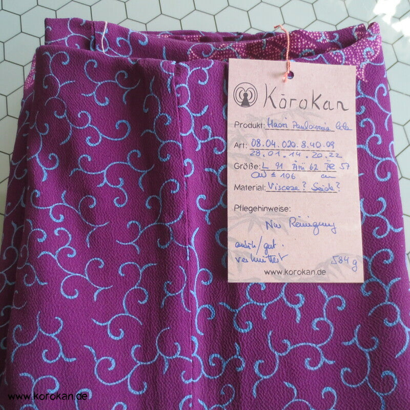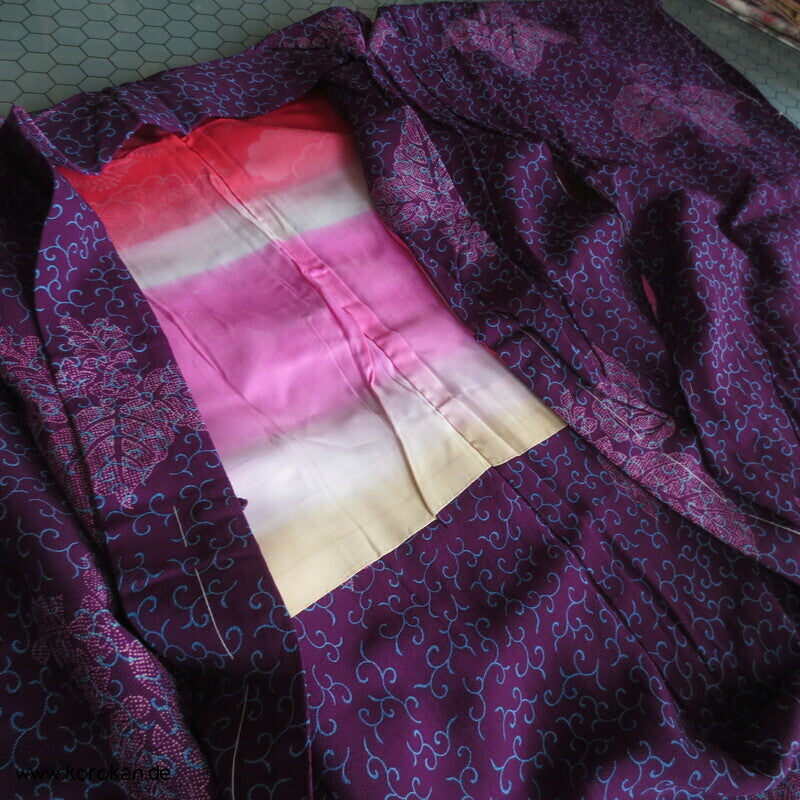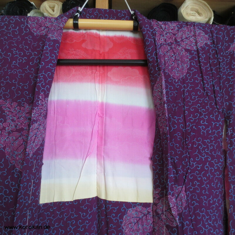 Vintage, eher antike Haori Kimono Jacke dunkellila Seidencrepe mit azurblauen arabeseken und Paulownia Blättern, oberem Seidenfutter mit bunten Streifen bedruckt