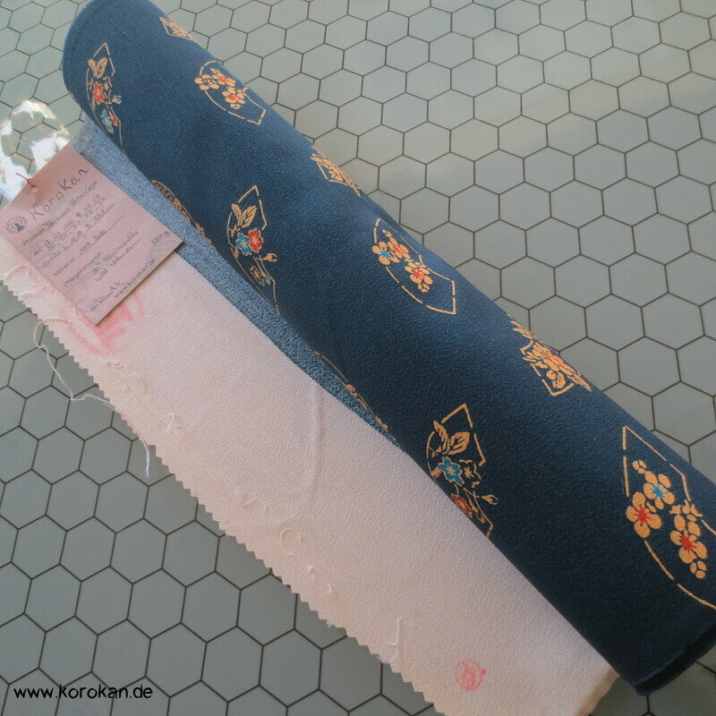 Musterfächer auf petrol Chirimen Kimono Seiden Crepe