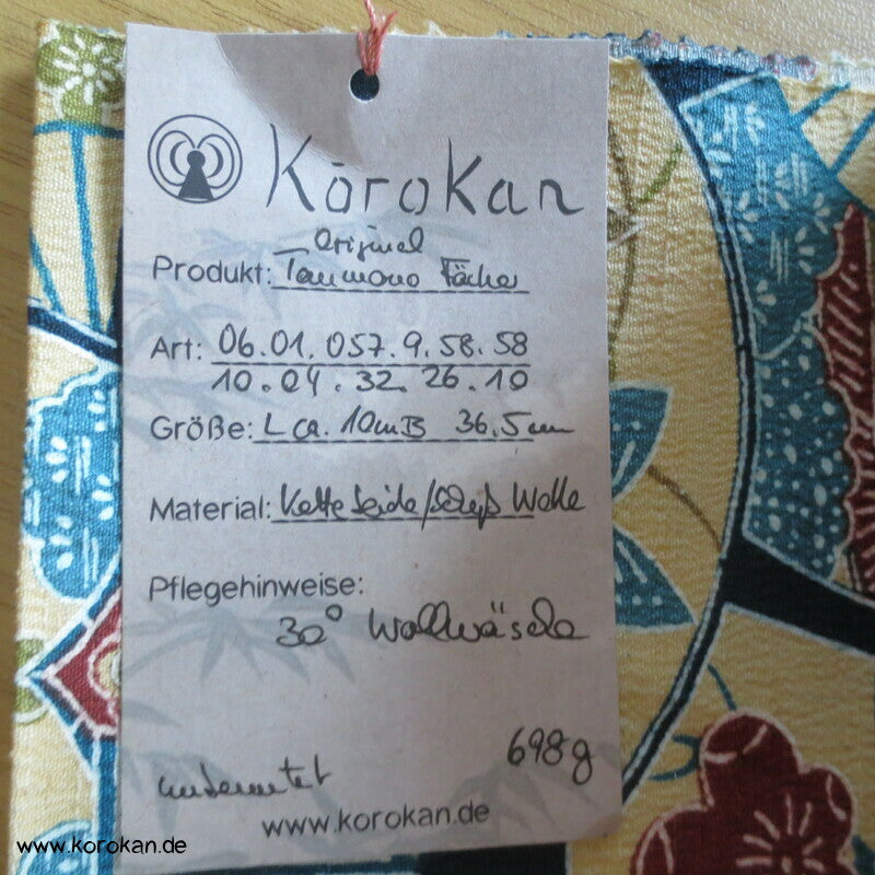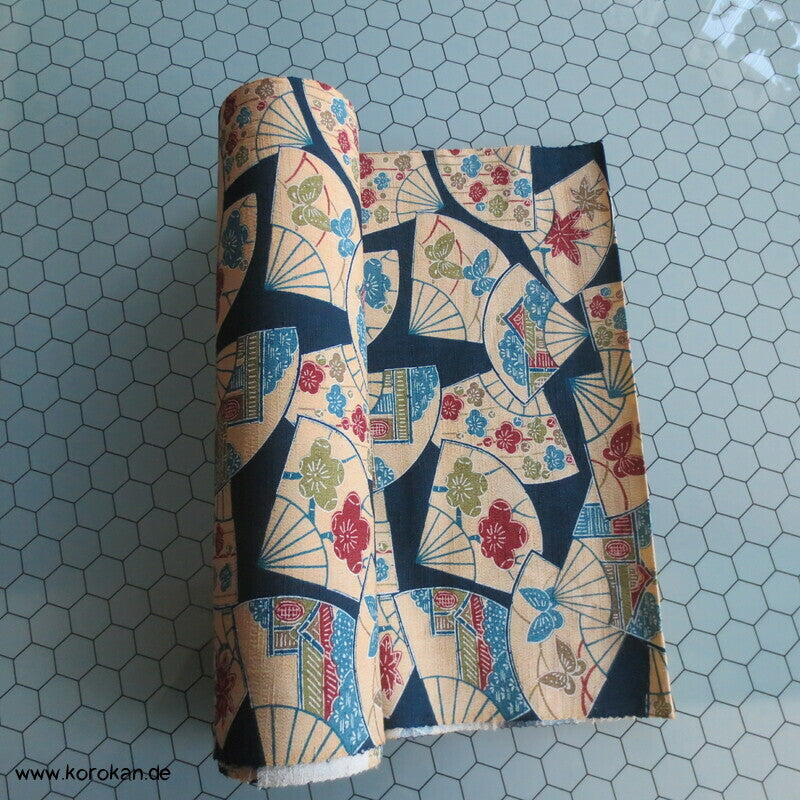 Vintage unbenutzte originalgeheftete Stoffrolle Fächerdruck auf grob gewebter Tsumugi Wolle / Seide Mischung Kimono Tanmono