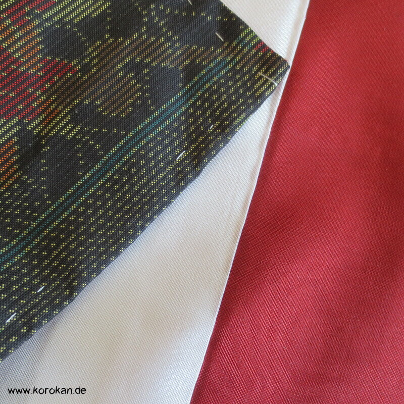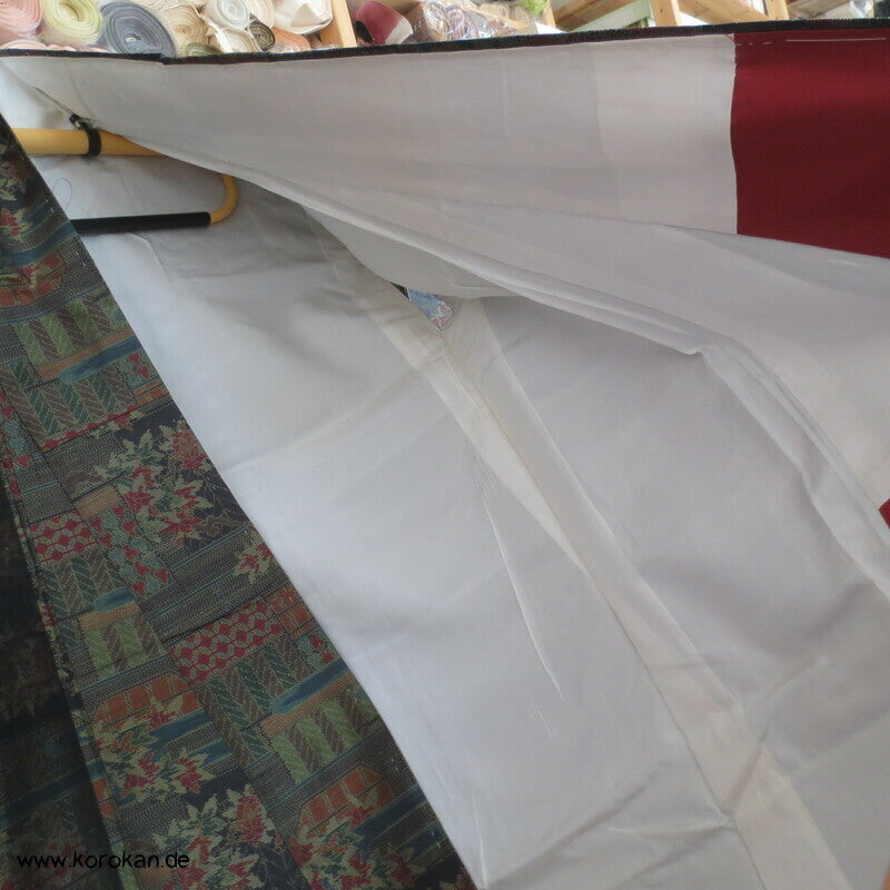 Vintage Kasuri garngefärbtes Patchwork Tsumugi Seide Komon, oberes Futter helle Seide, unteres Hakkake Futter ziegelrote Honan Seide