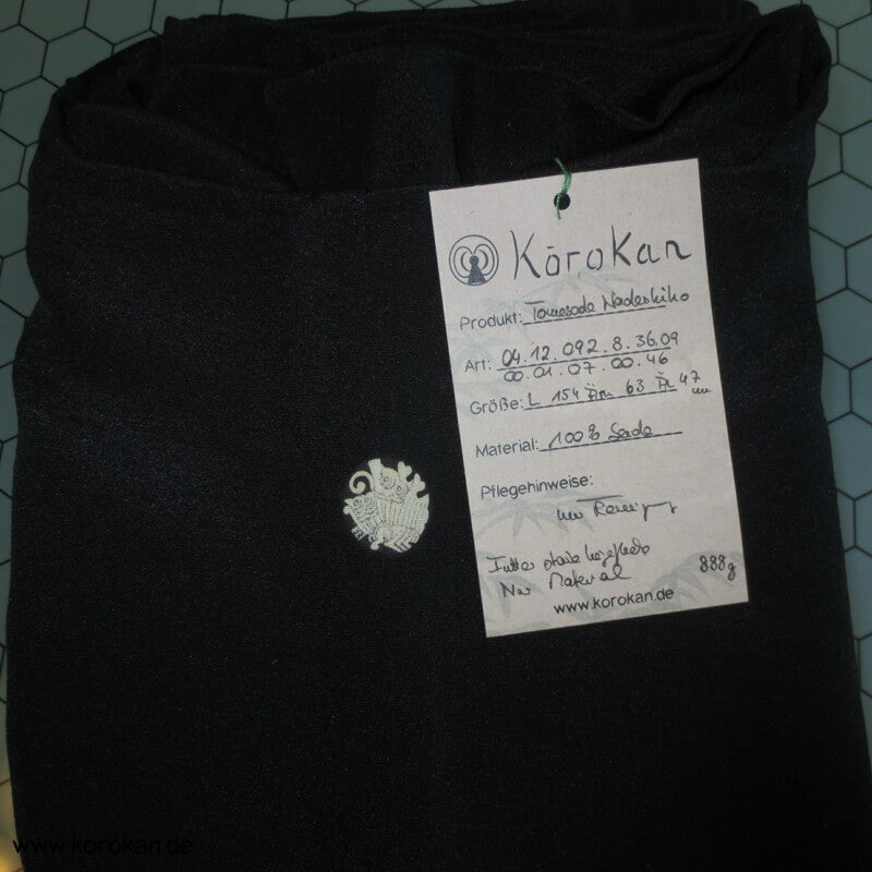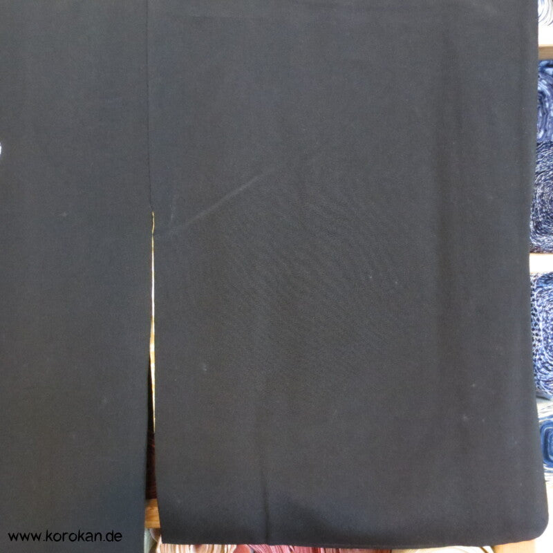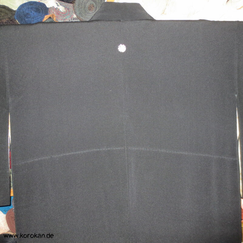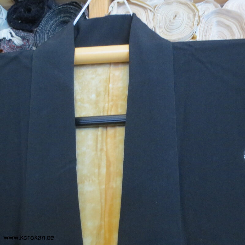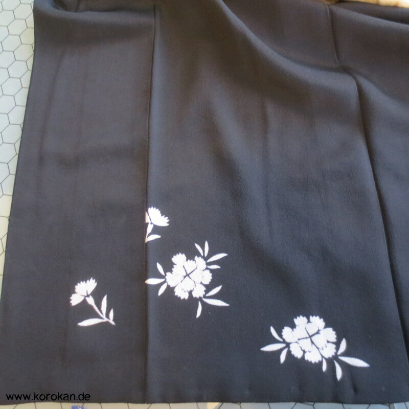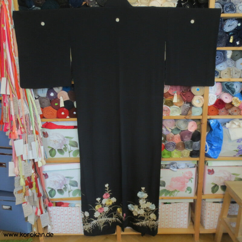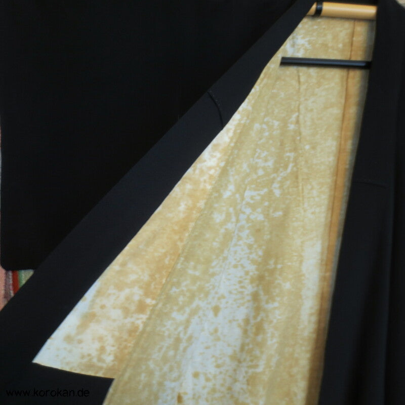 japanischer Vintage Tomesode formeller Kimono aus schwarzem Crepe, bemalt und bestickt mit Grasnelken mit viel Gold, 5 Mon, oberes Futter hell stark liegefleckig, unteres Futter aus Oberstoff mit Motiven.