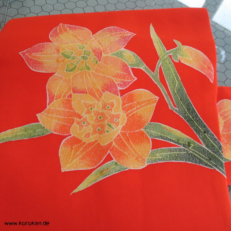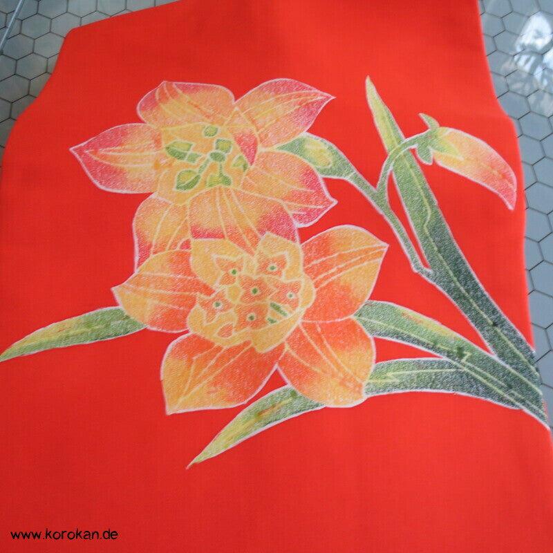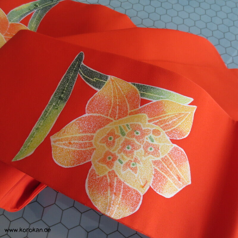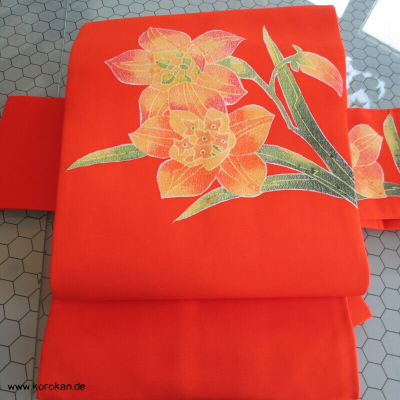 Vintage Nagoya Obi orange Rips mit gemalten Osterglocken, wohl Seide, aber nicht sicher.