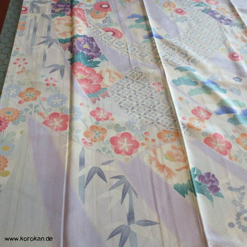 Noshi auf flieder, feiner leichter Furisode Seidendamast Kimono