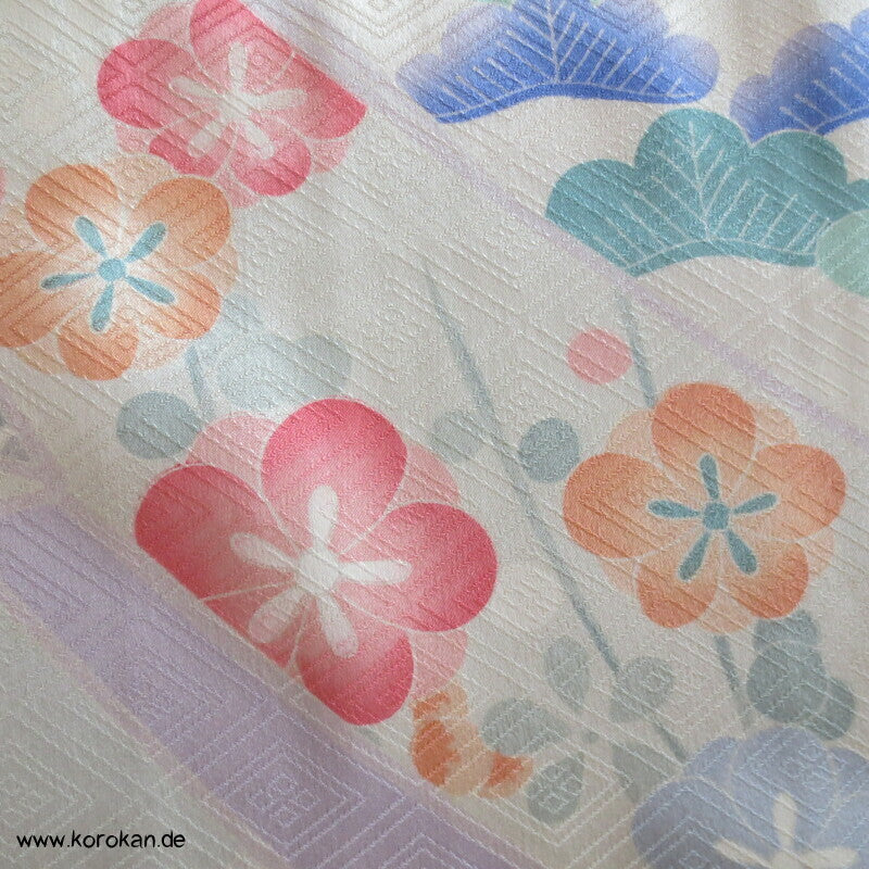 Seidendamast gewebte Diamantrauten, Noshi Streifen mit lauter unterschiedlichen klassisch japanischen Mustern in zart pastelligen Farben, oberes Futter helle Seide, unteres Hakkake Seidenfutter hell im Oberstoffgewebe.