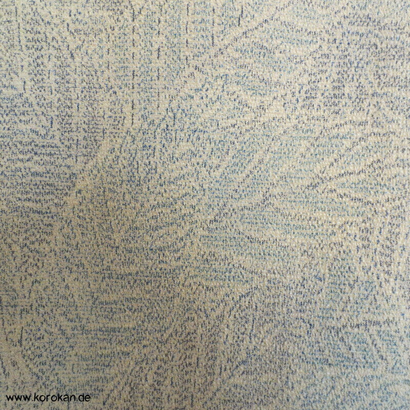 Vintage Tsumugi Seide (?) Komon Kasuri Bananenblätter grau in curry, oberes Futter hell, unteres Hakkake Futter Seide curry, stark strukturierter Crepe mit abwechseln dünneren und dickeren Schussfäden, sehr griffig