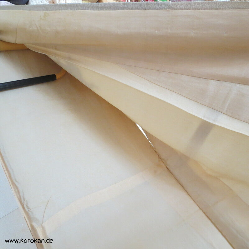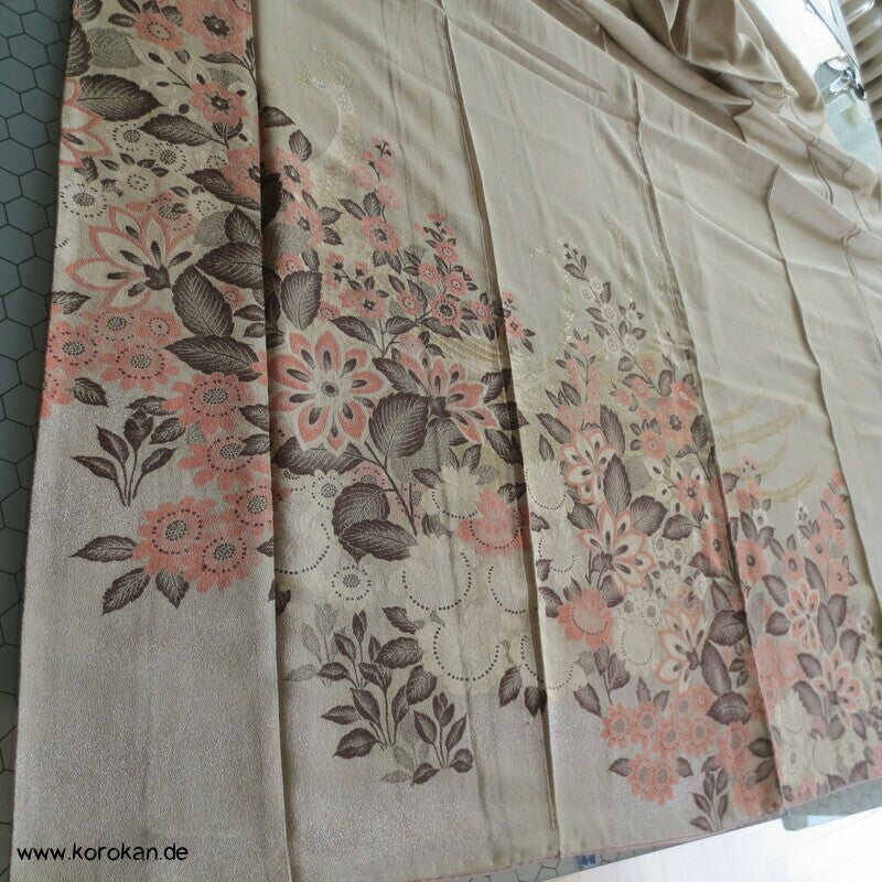 Vintage Homongi Kimono Seidenbrokat auf Crepe Basis mit Pfau zwischen Blumen in Lurex und Urushi Fäden gewebt, feinem oberen hellen Seidenfutter und unterem Hakkake Seidenfutter in blass rosa