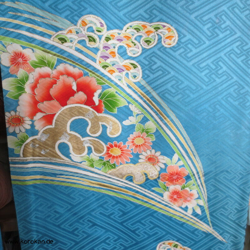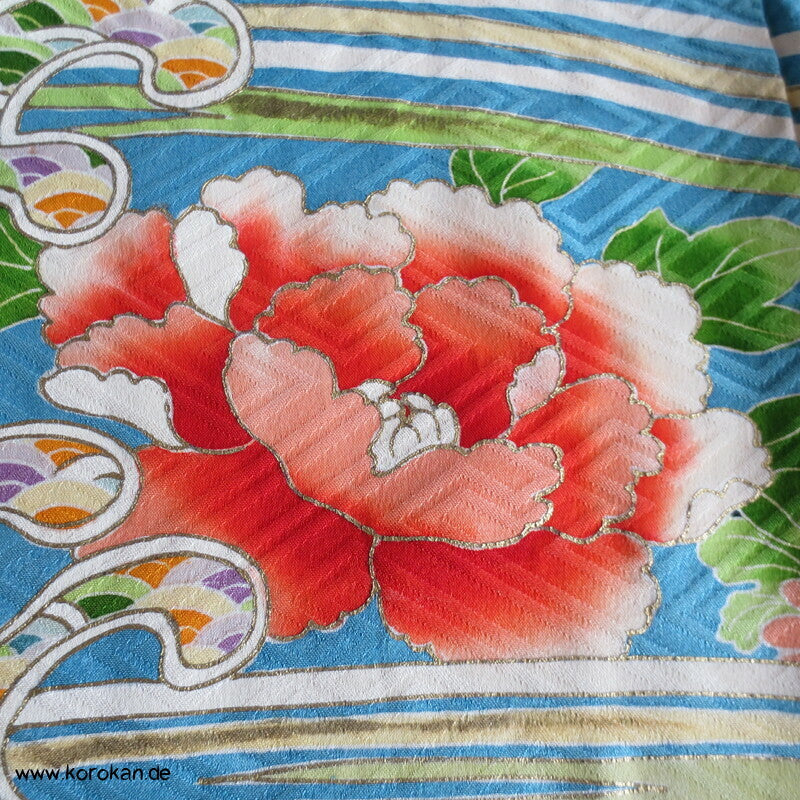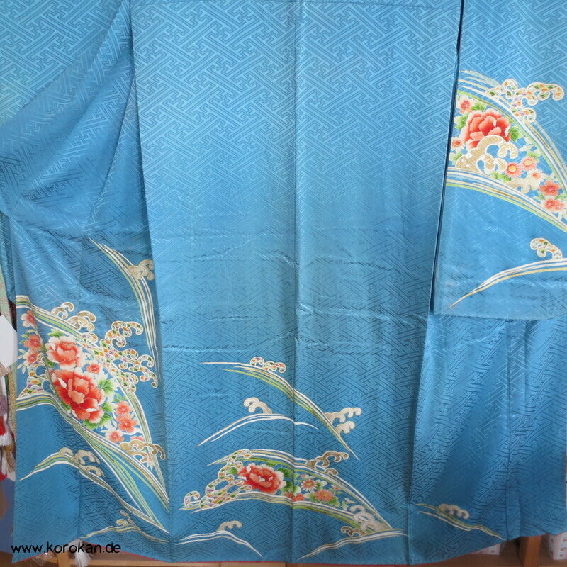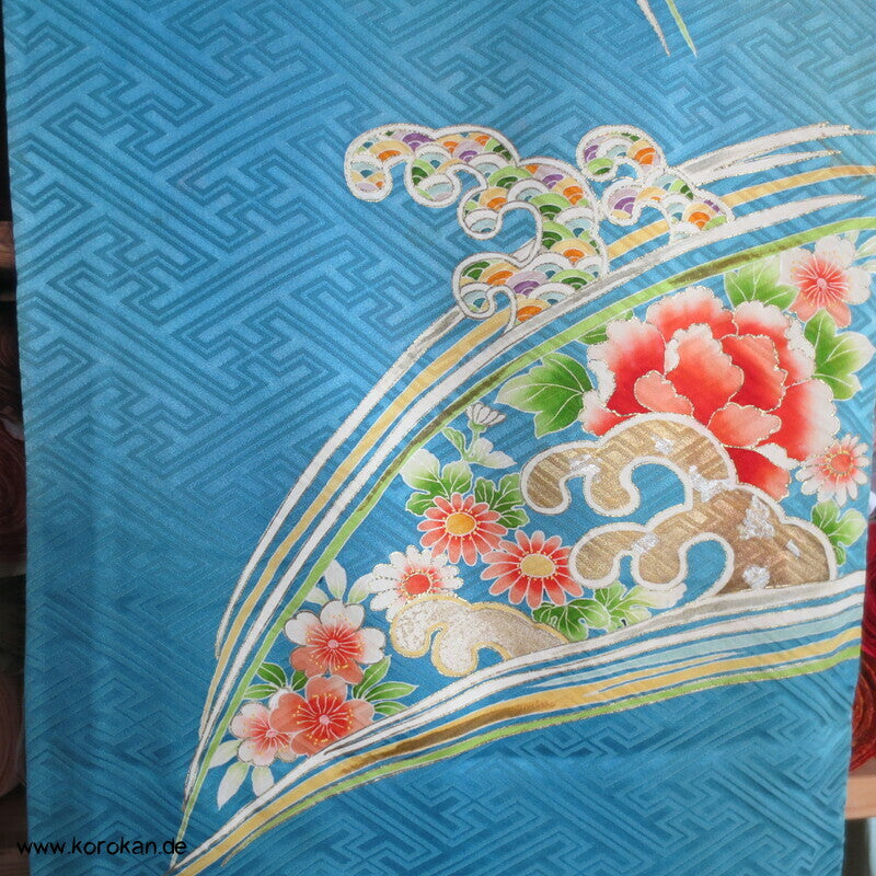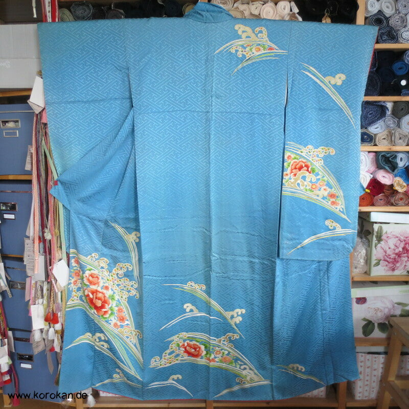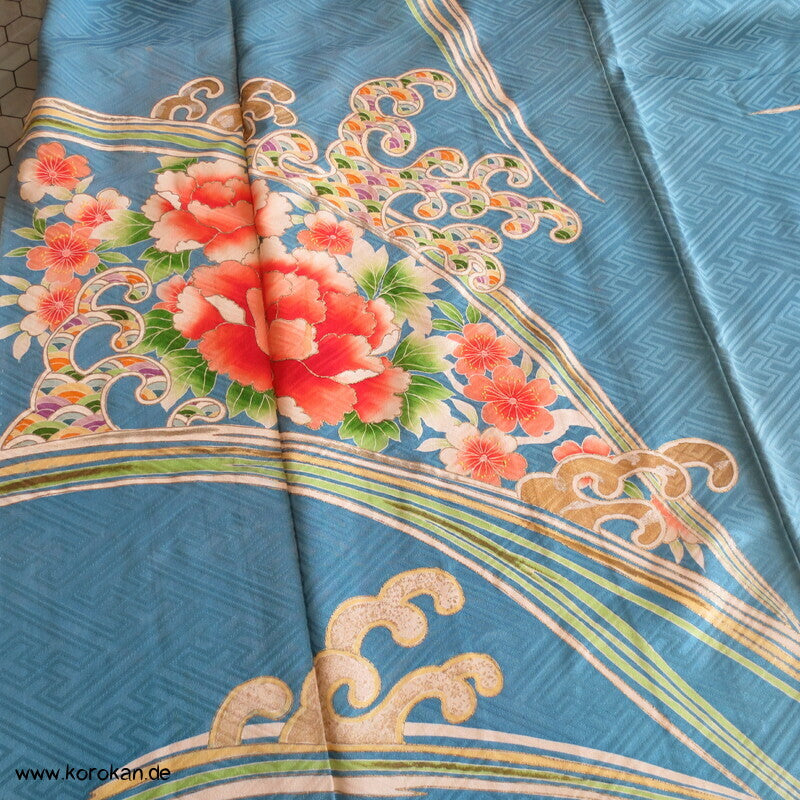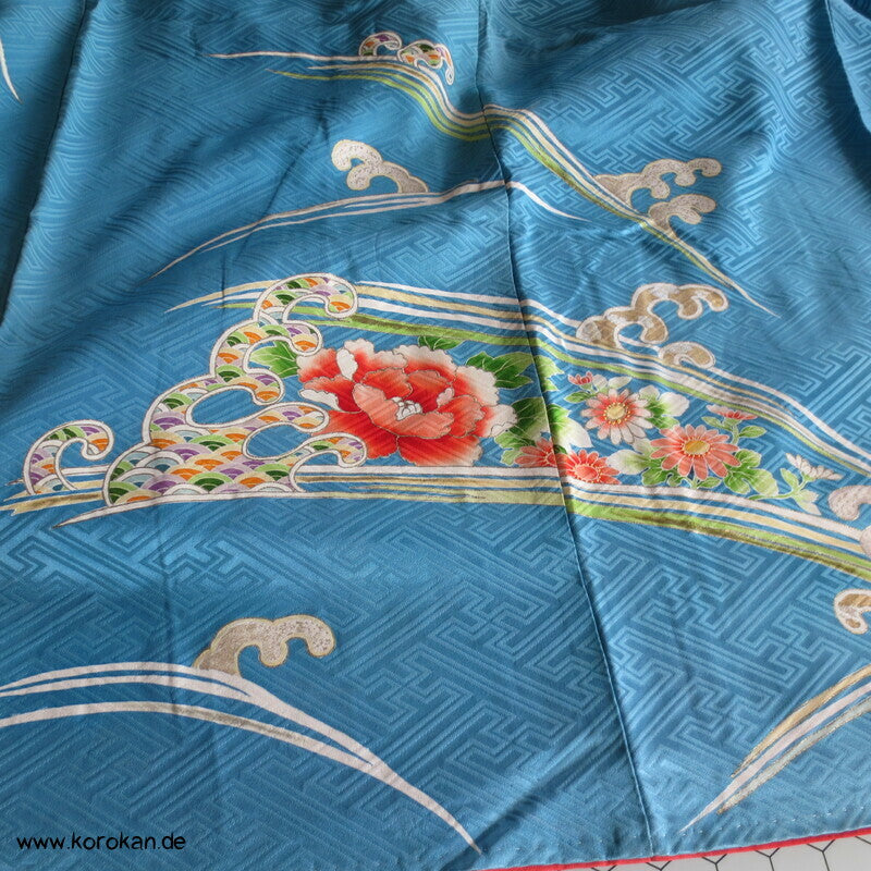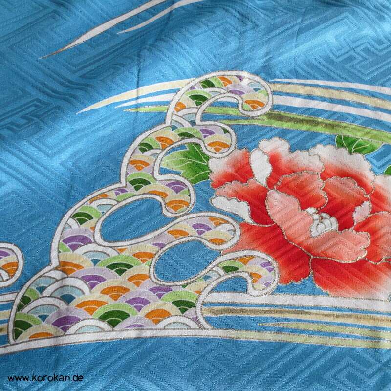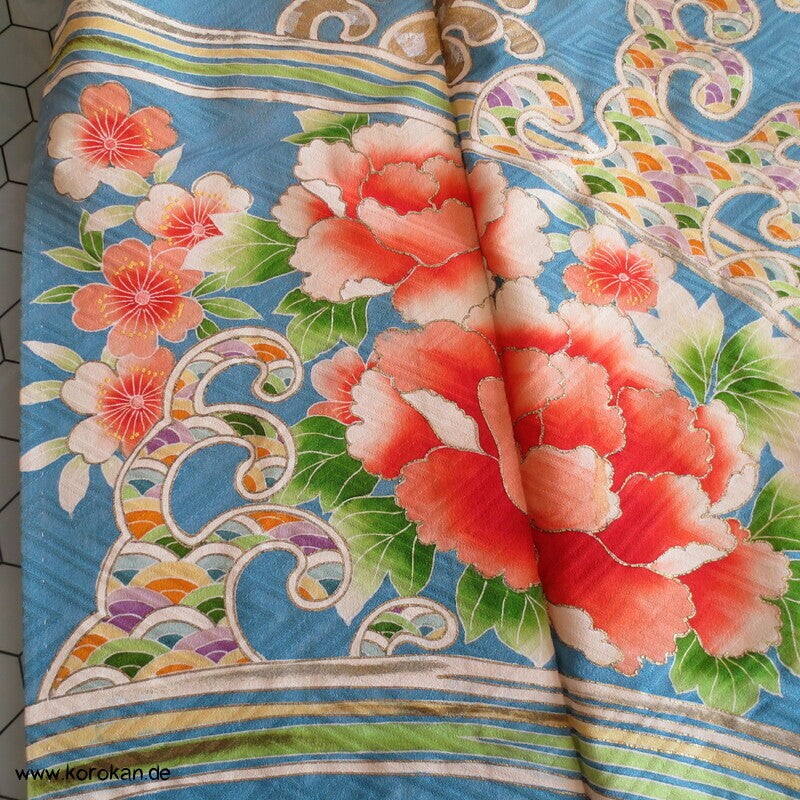 japanischer Vintage Furisode Kimono Sayagata Seidendamast bemalt mit bunten Wellen und Päonien auf azurblauem Grund, Goldauflage