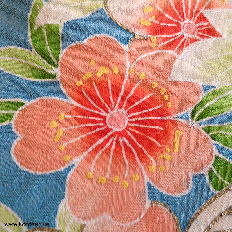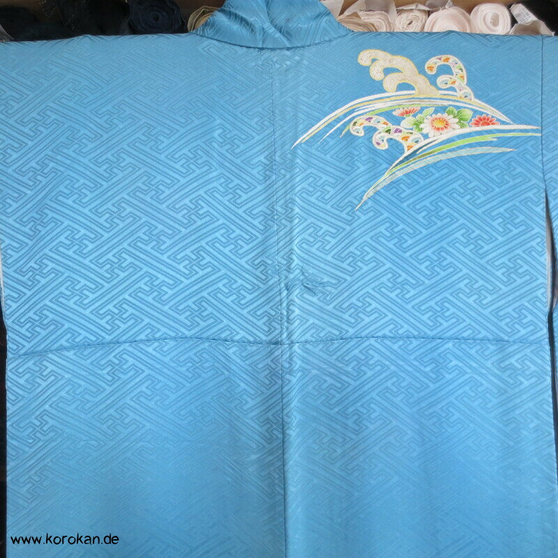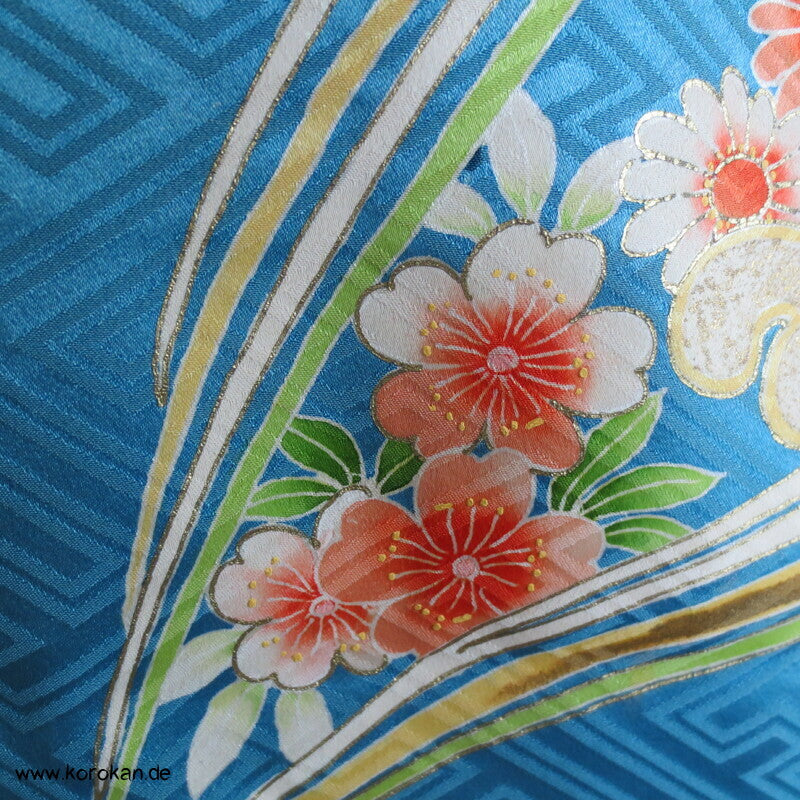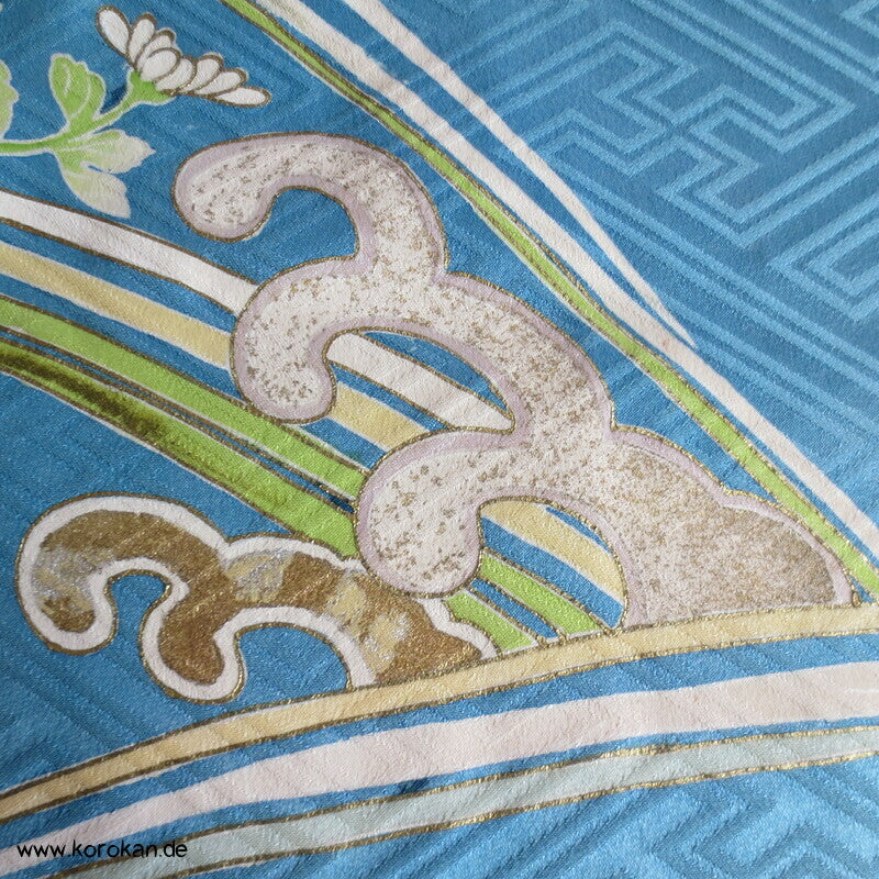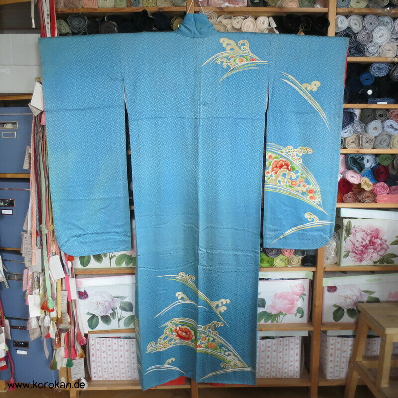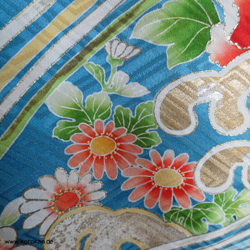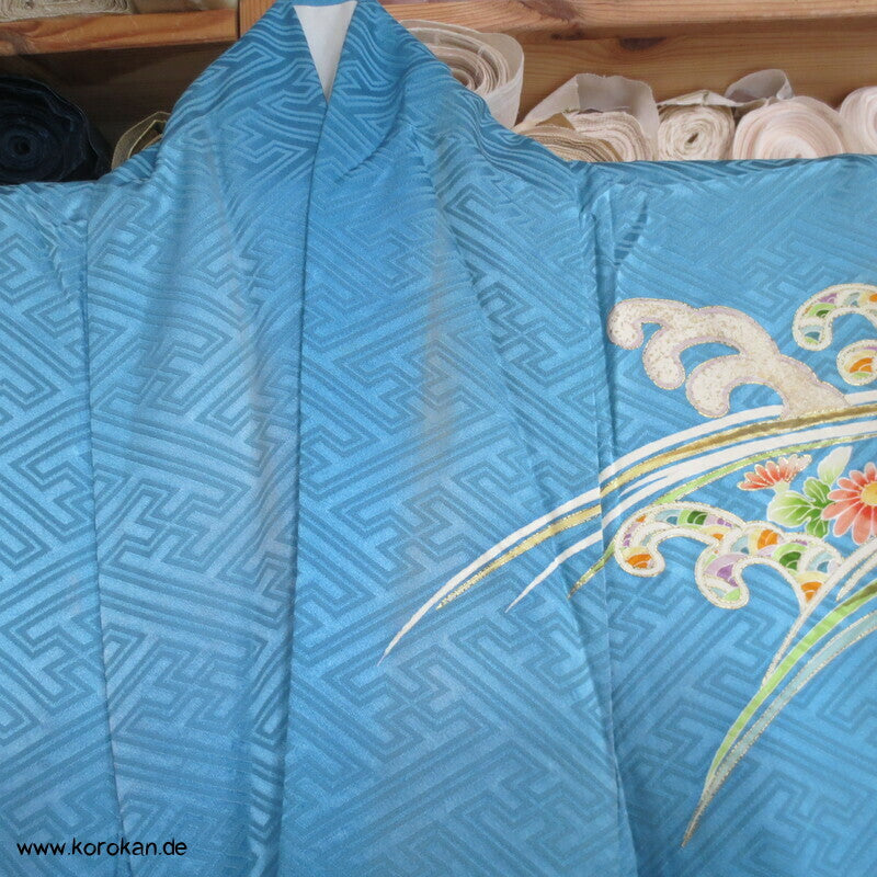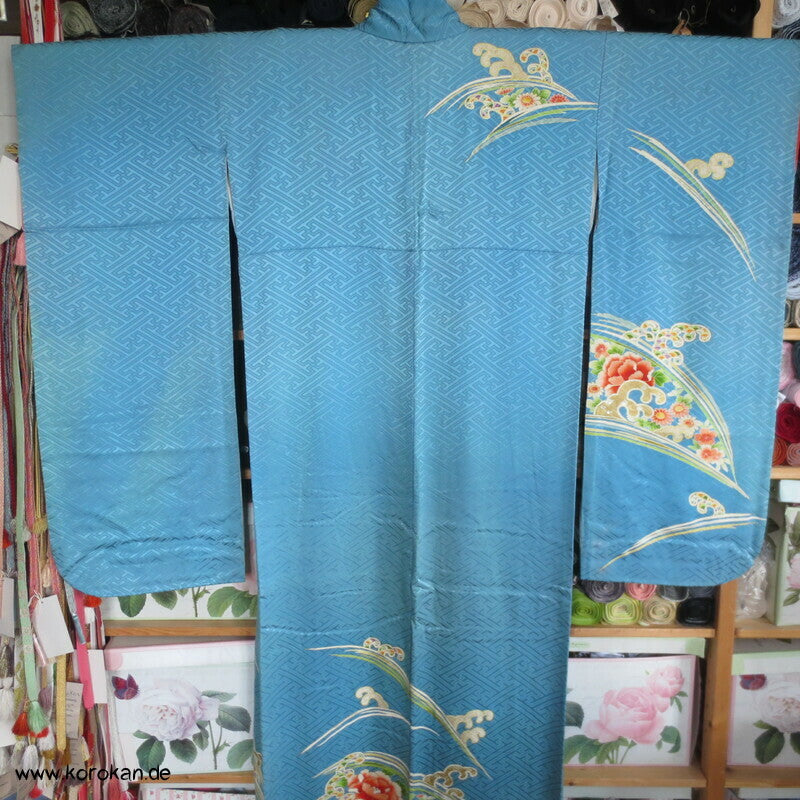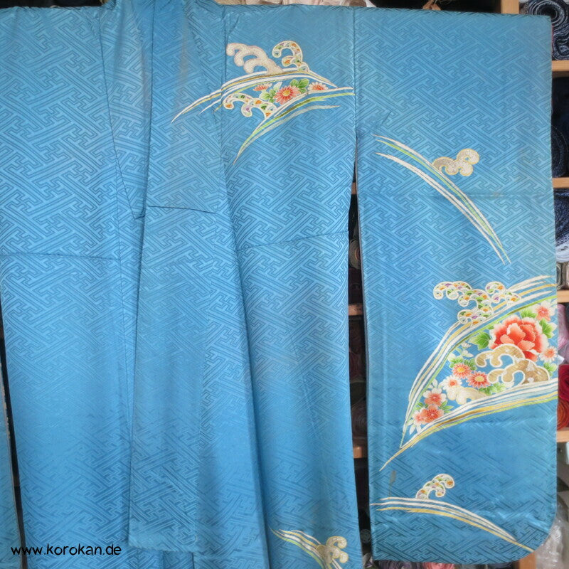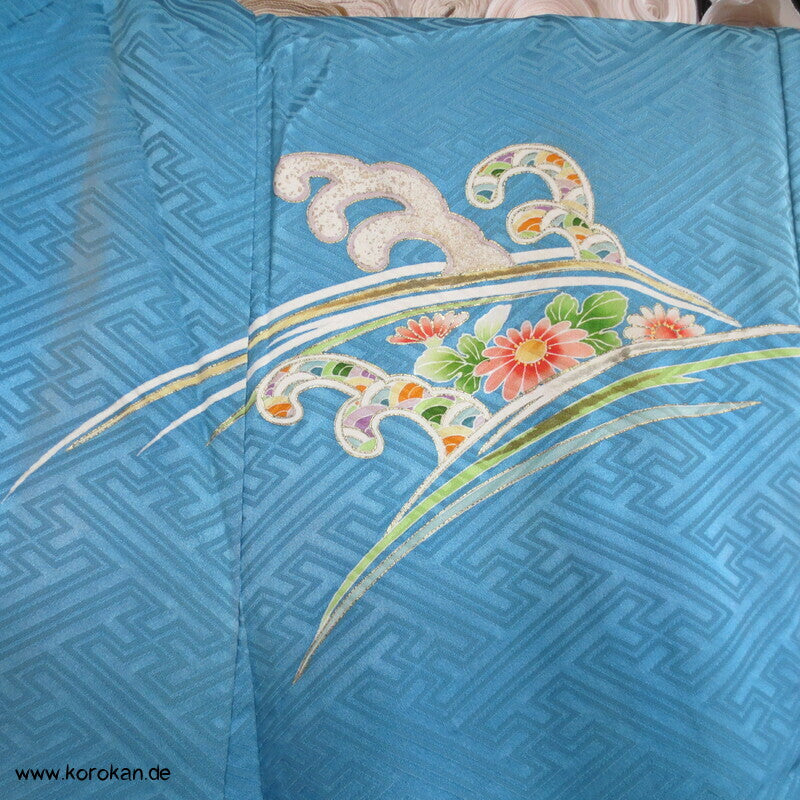 japanischer Vintage Furisode Kimono Sayagata Seidendamast bemalt mit bunten Wellen und Päonien auf azurblauem Grund, Goldauflage