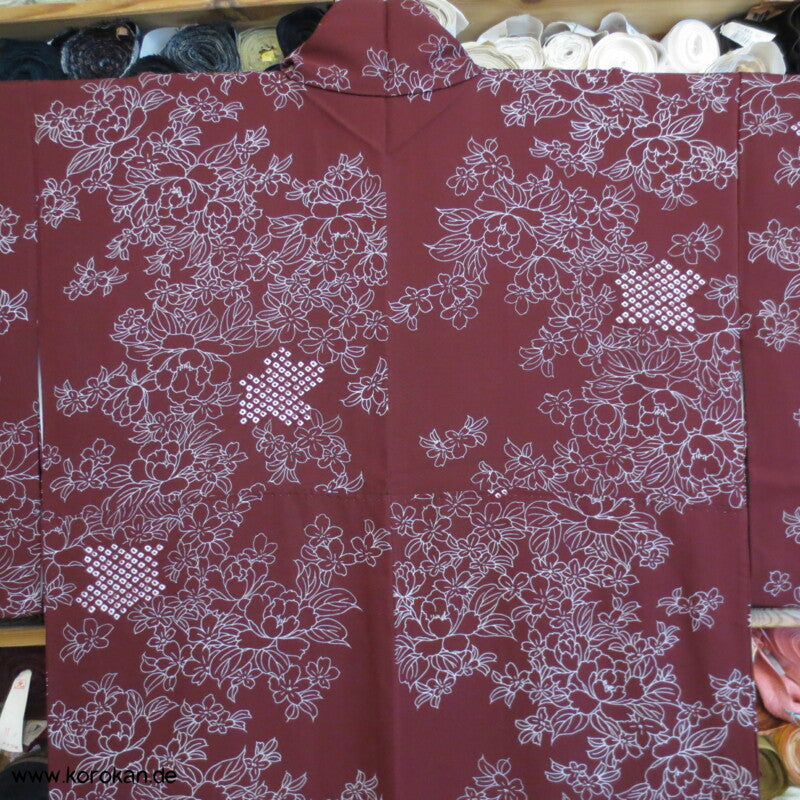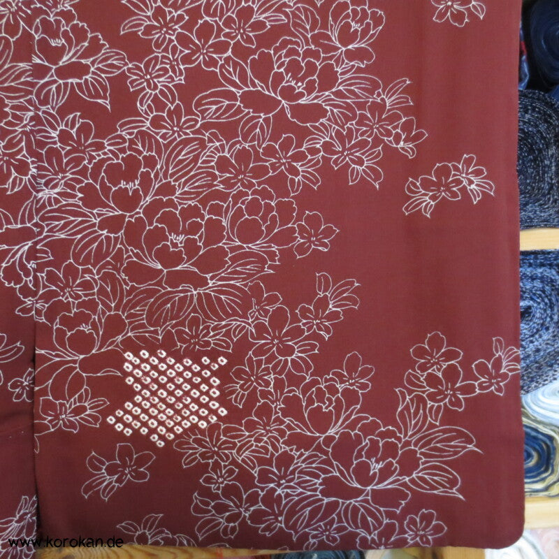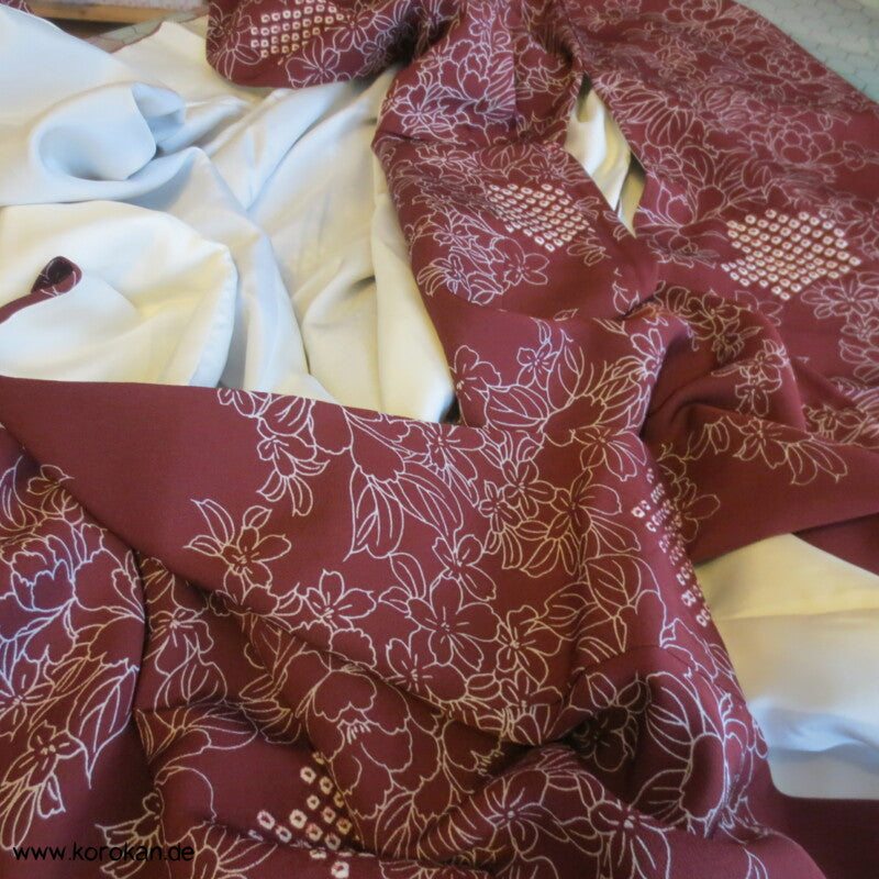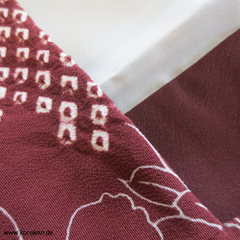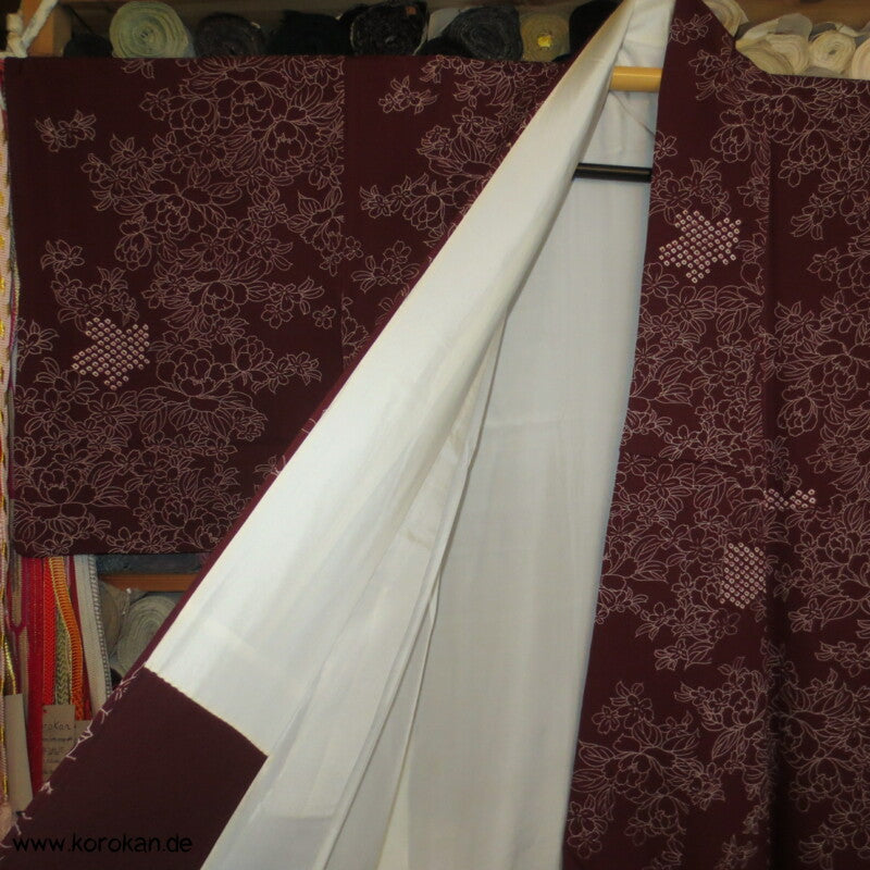 Vintage Komon Kimono Päonien und Blätter in Strichzeichnung weiß in weinrot mit Shibori Elementen Chirimen Seidencrepe, oberem hellen Seidenfutter und unterem Hakkake Futter Seidencrepe braunrot