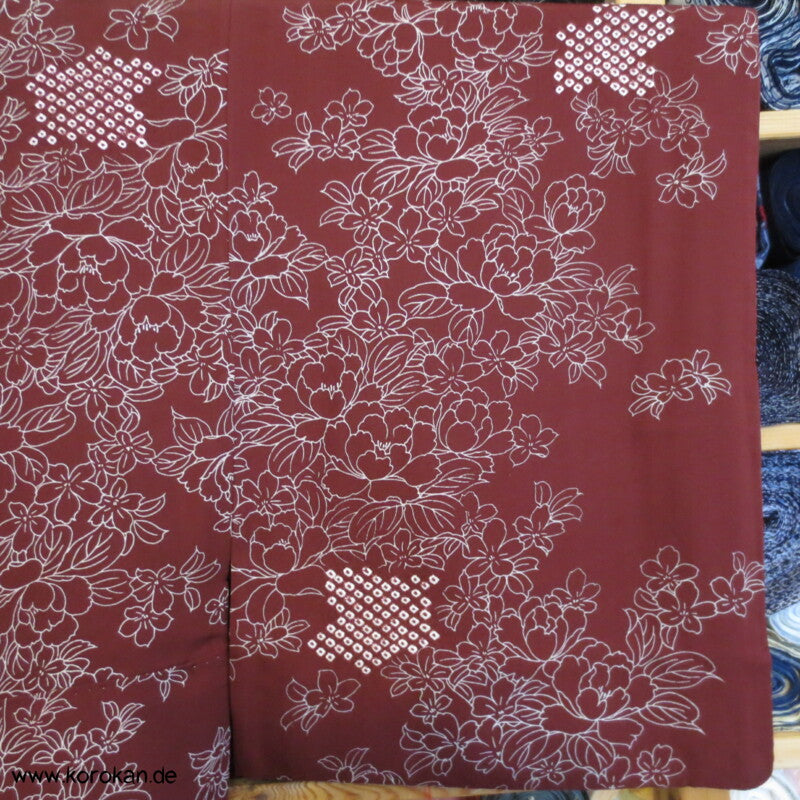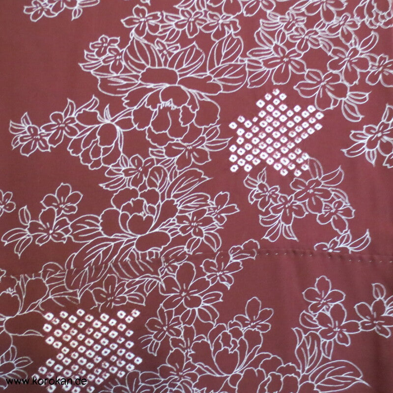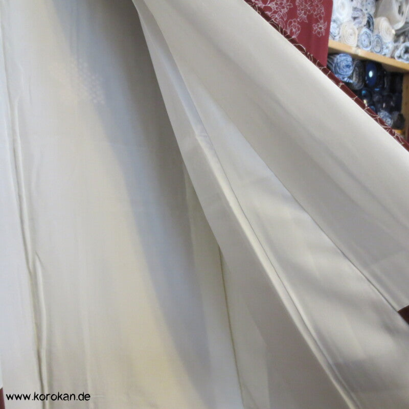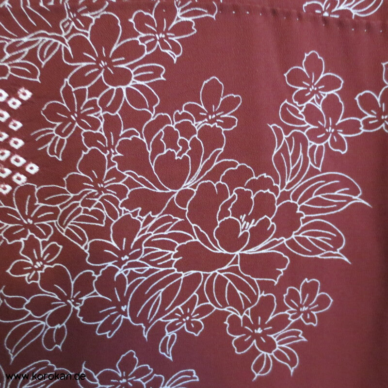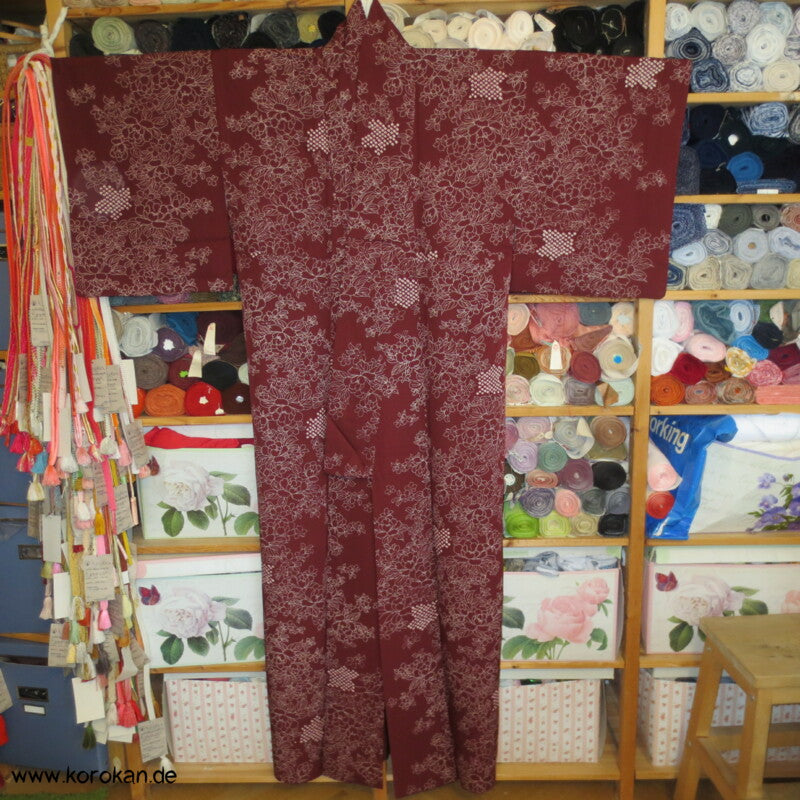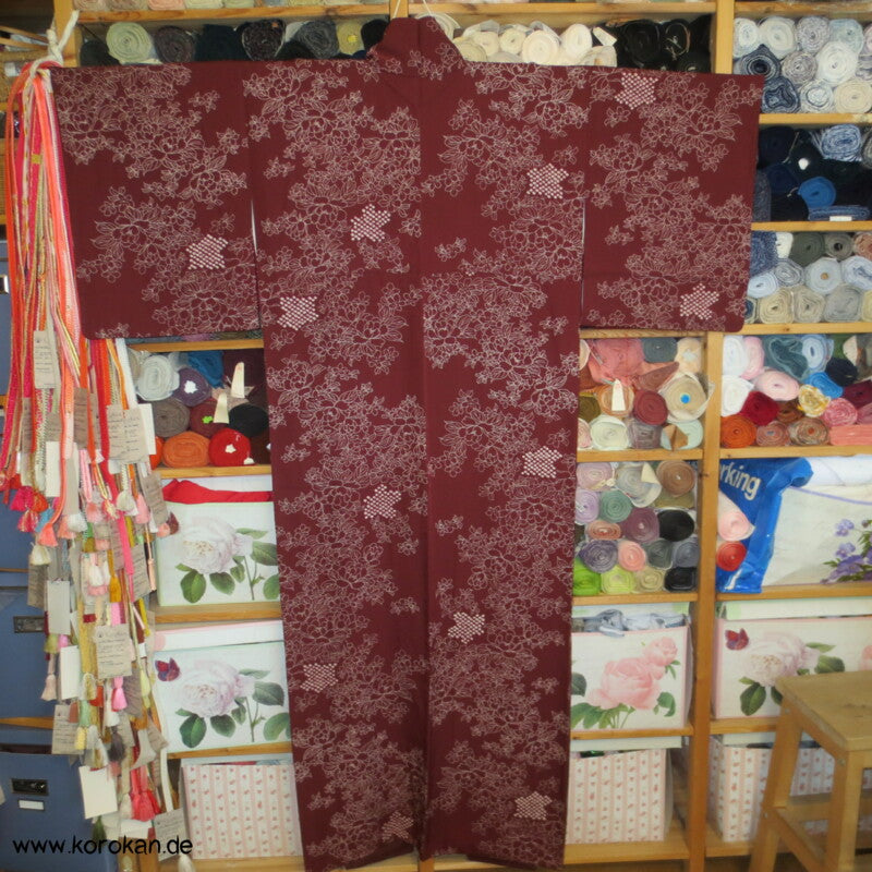 Vintage Komon Kimono Päonien und Blätter in Strichzeichnung weiß in weinrot mit Shibori Elementen Chirimen Seidencrepe, oberem hellen Seidenfutter und unterem Hakkake Futter Seidencrepe braunrot