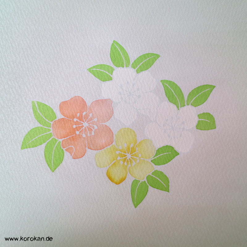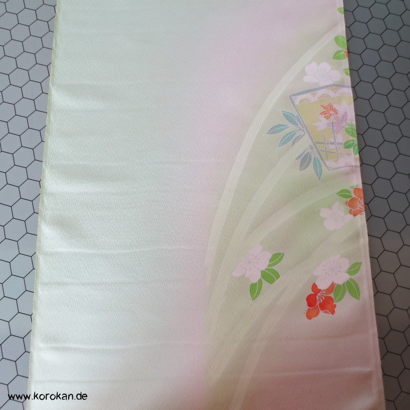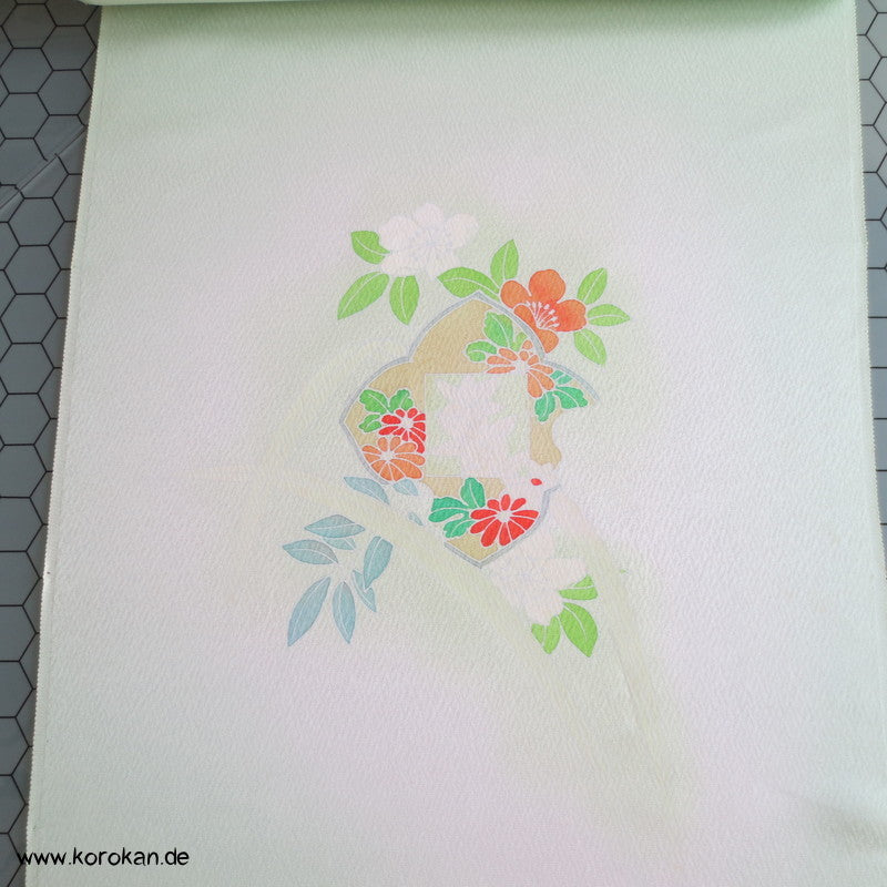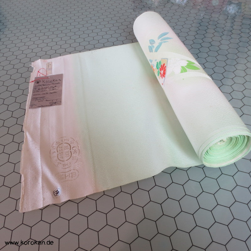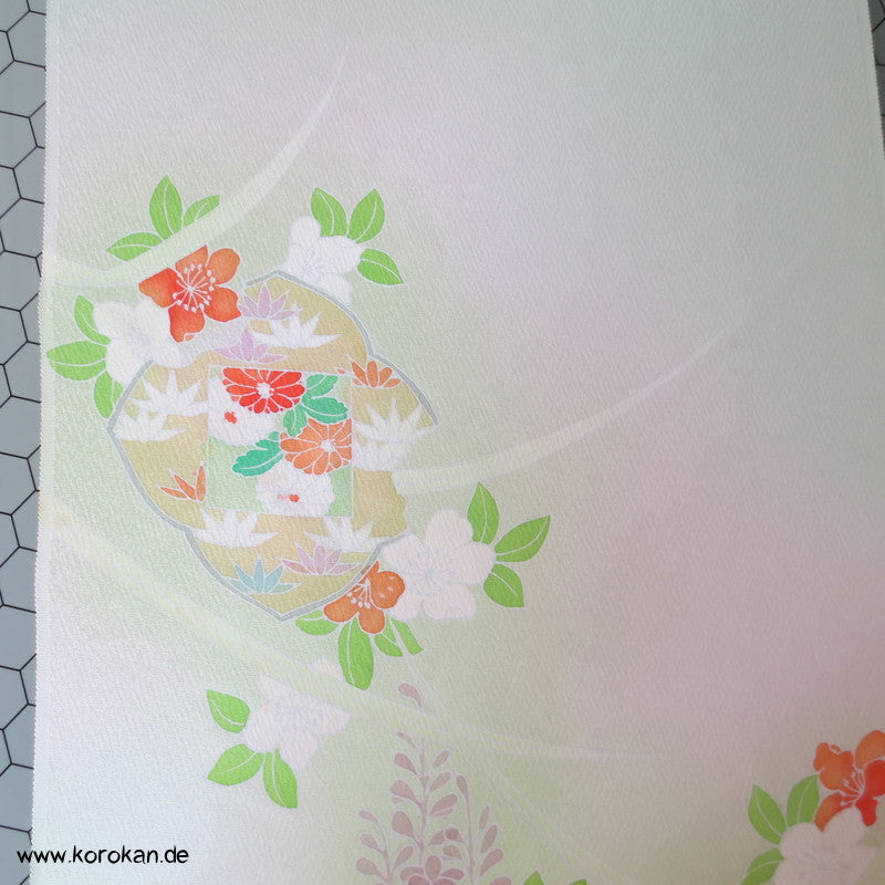 Pastell Blumen auf hellgrüner Crepe Seide Tanmono, handbemalt, Yuzen