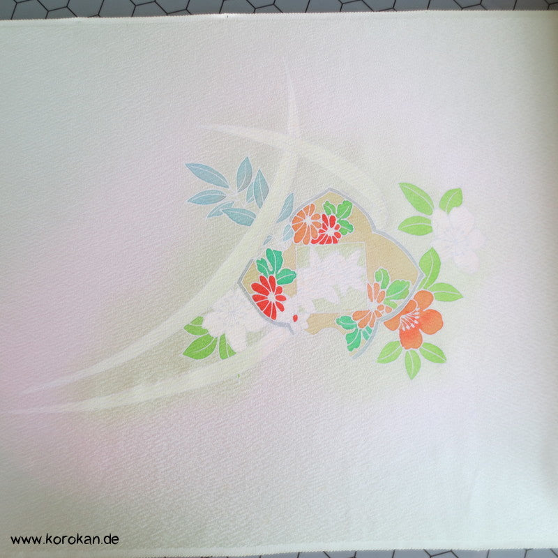 Vintage unbenutzter japanischer Stoffballen Crepe Seide, bemalt mit verschiedenen Blüten für einen ganzen Homongi Kimono. Das Muster ist unregelmäßig im Stoff verteilt und wird erst durch das genaue Zusammensetzen der Bahnen ein ganzes Bild.