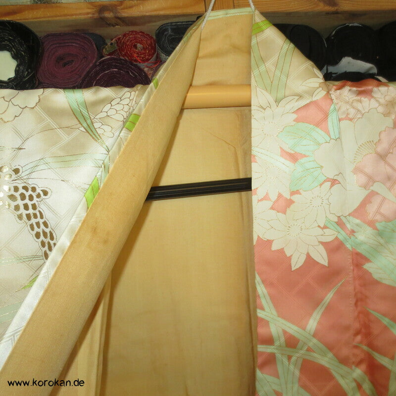 Vintage Furisode Higaki Flechtmuster Seidendamast Kimono goldenen Reisähren, Blüten, Blumen, viel Gold und Goldstickerei, oberes Futter helle nachgedunkelte Seide, unteres Hakkake Seidenfutter mit Bokashi Farbverlaufsrand in orange.
