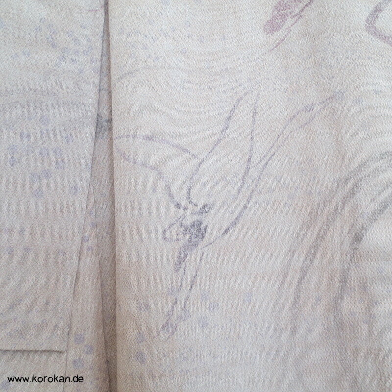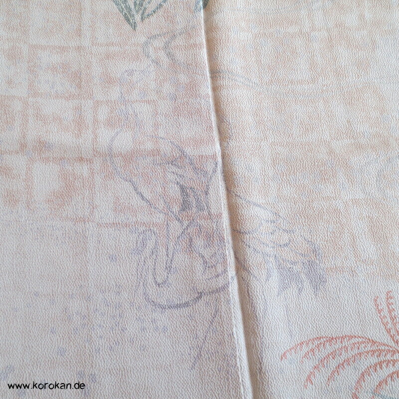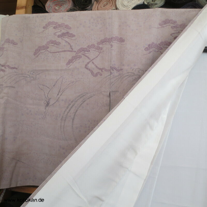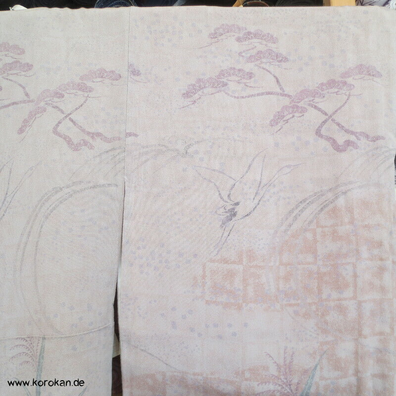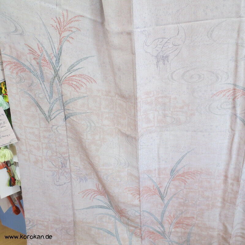 Vintage Homongi Kimono dicker Seiden Chirimencrepe mit auffliegenden Reihern / Kranichen über Bambus und schilf, feinem oberen hellen Seidenfutter und unterem Hakkake Seidenfutter