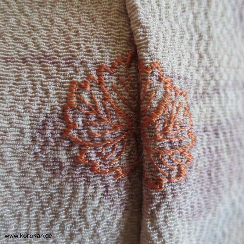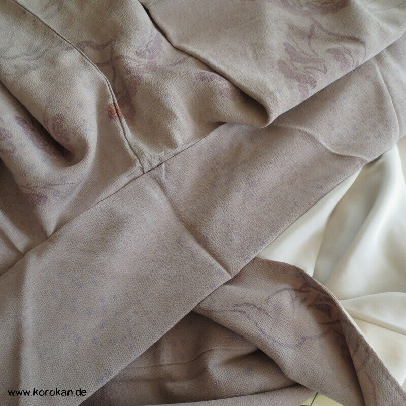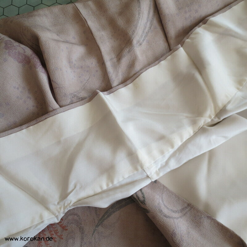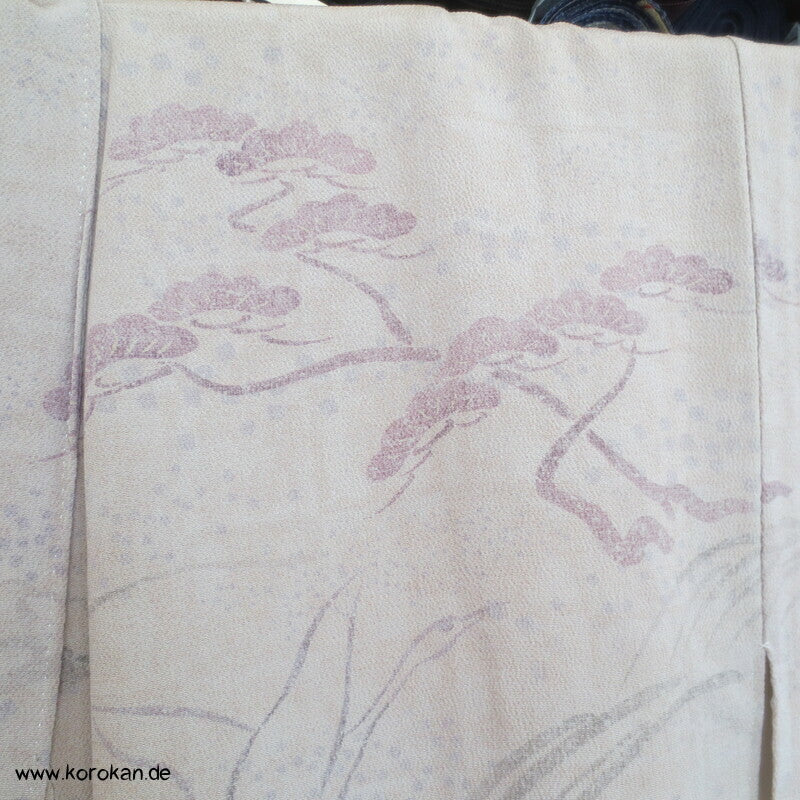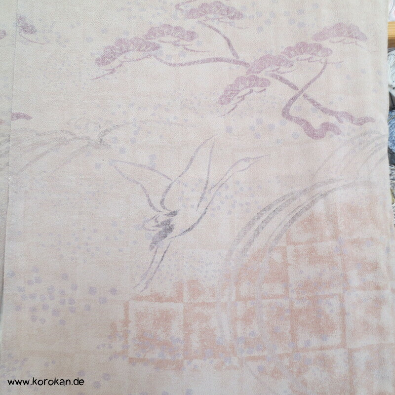 Vintage Homongi Kimono dicker Seiden Chirimencrepe mit auffliegenden Reihern / Kranichen über Bambus und schilf, feinem oberen hellen Seidenfutter und unterem Hakkake Seidenfutter