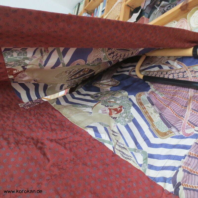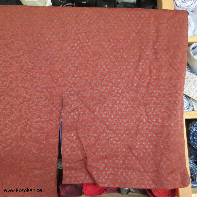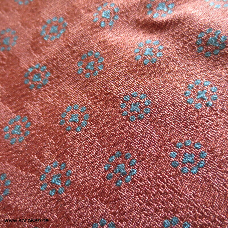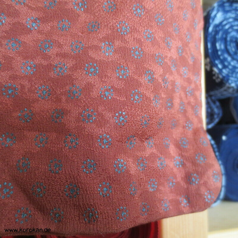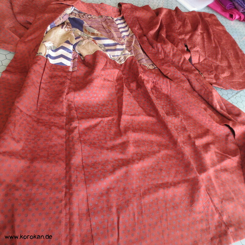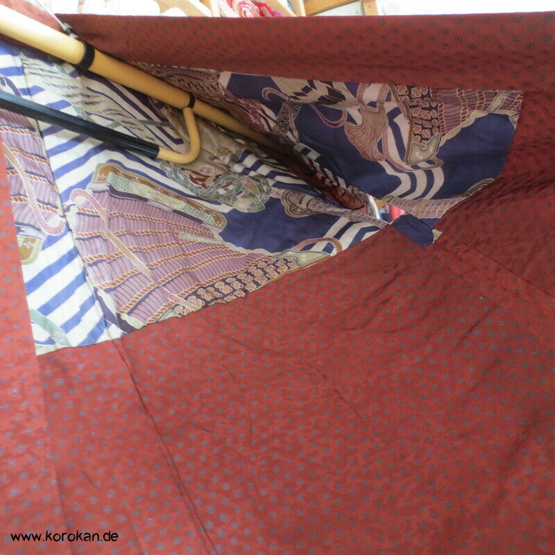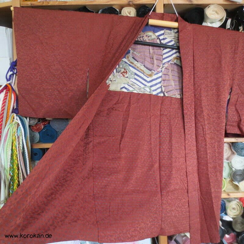 Vintage, eher antike Haori Kimono Jacke aus feiner japanischer Damast Seide mit petrolblauen Lackpunkte Blumendruck auf zimtbraun und einem mit Samurai Motiven bedruckten Seidenfutter.