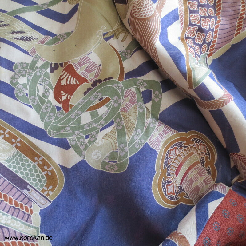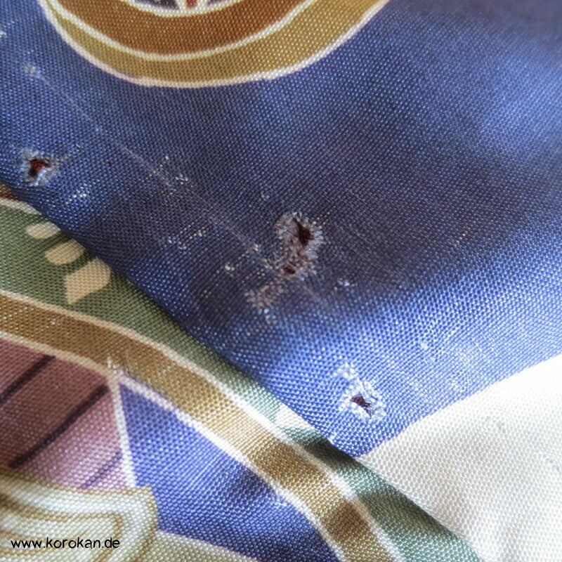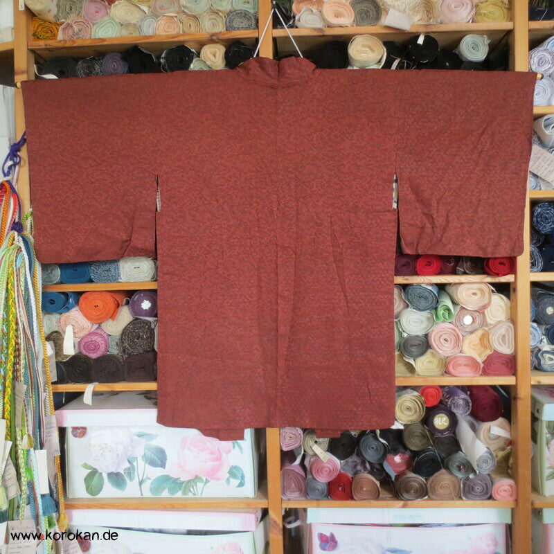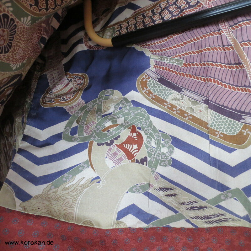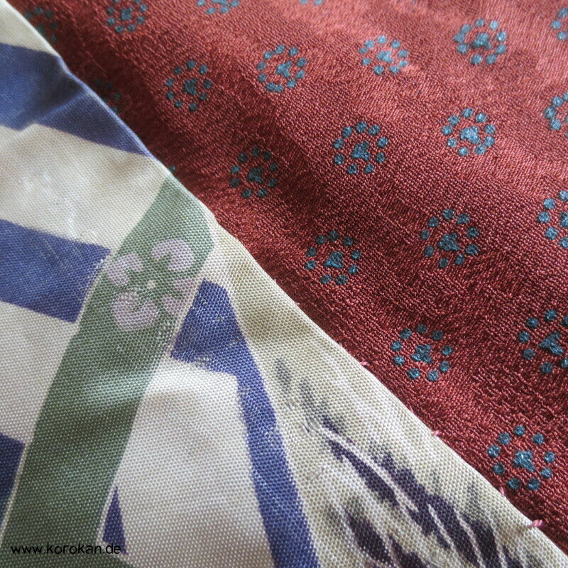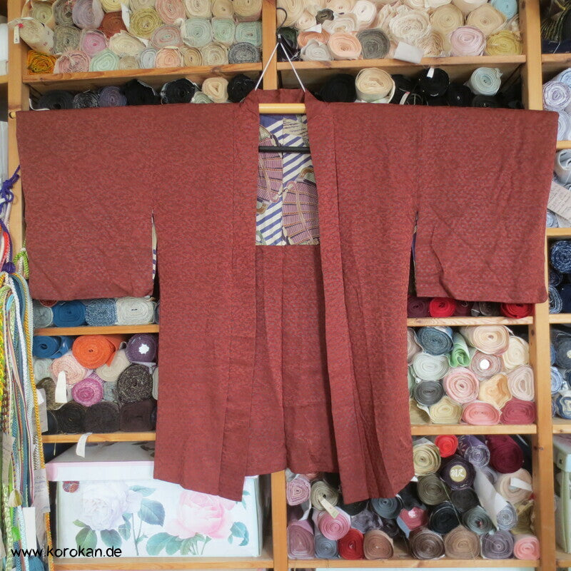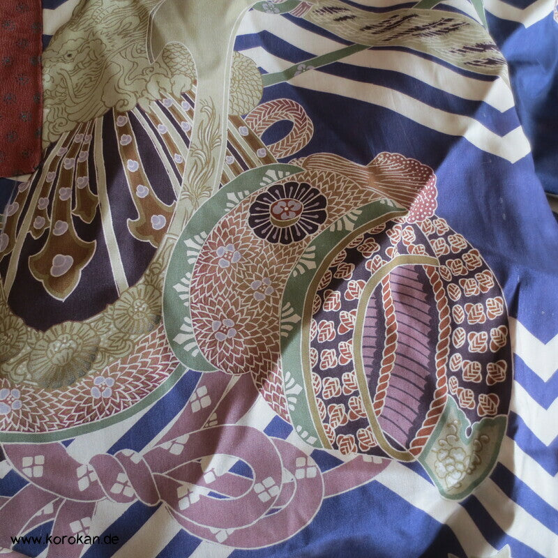 Vintage, eher antike Haori Kimono Jacke aus feiner japanischer Damast Seide mit petrolblauen Lackpunkte Blumendruck auf zimtbraun und einem mit Samurai Motiven bedruckten Seidenfutter.