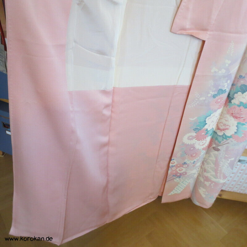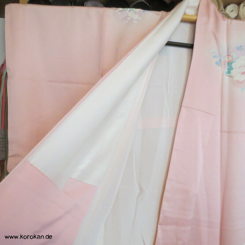 Vintage Tsukesage Kimono sakurarosa Seidencrepe mit Yuzen handgemalten feinen Päonien, feinem oberen hellen Seidenfutter und unterem Hakkake rosa Bokashi Verlaufsrand Seidenfutter.