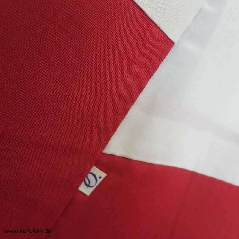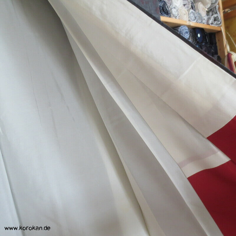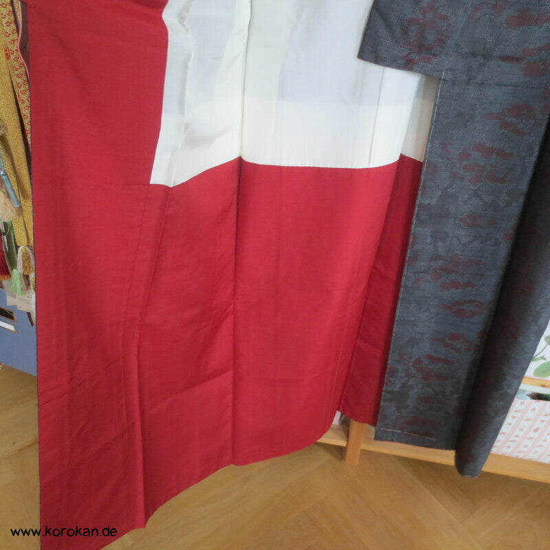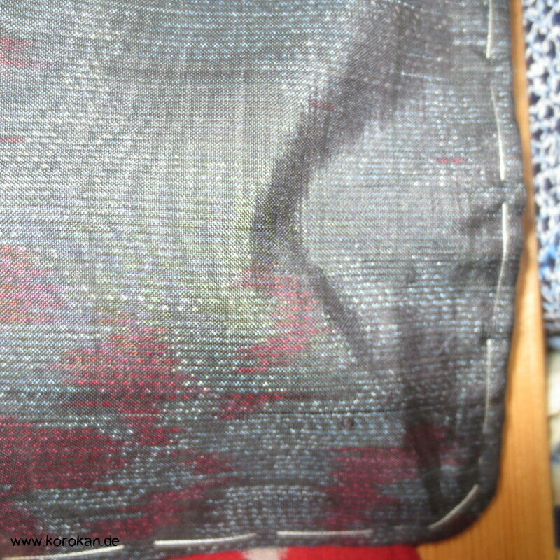 Vintage Tsumugi Seiden Komon Kimono Kasuri Pfingsrosen Blüten in jeansblau, oberes Futter hell, unteres Hakkake Futter in roter Honan Seide