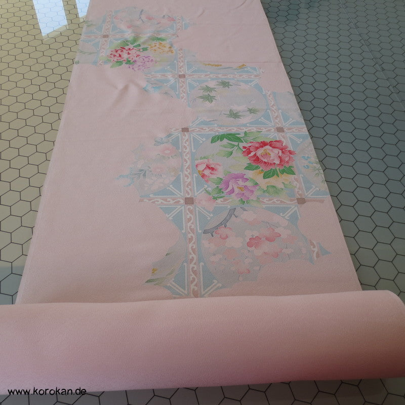 Vintage unbenutzter japanischer Stoffballen Damast Seide mit Pfingstrosen in Gitter für einen ganzen Homongi Kimono. Das Muster ist unregelmäßig im Stoff verteilt und wird erst durch das genaue Zusammensetzen der Bahnen ein ganzes Bild.