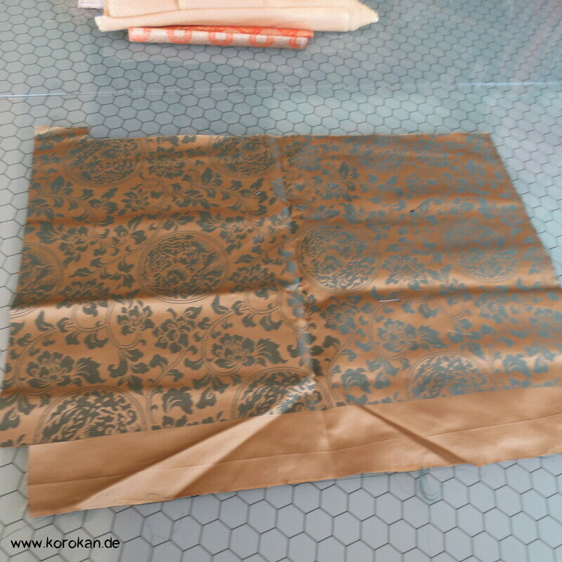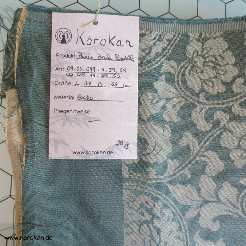 Vintage unbenutzter Kimono Stoffrest Seiden Jacquard Phönix und Drachenrondelle in messing auf graugrün