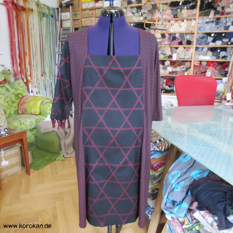 Prinzeßlinien Kleid mit eckigem Ausschnitt in einer Kombination aus schwarzer Tsumugi Seide mit Kasuri Asanoha Muster und Viscose Elasthan Jersey mit feinem Shippo Muster - farblich genau abstimmt - durch den Jersey an der Seite sehr bequem.