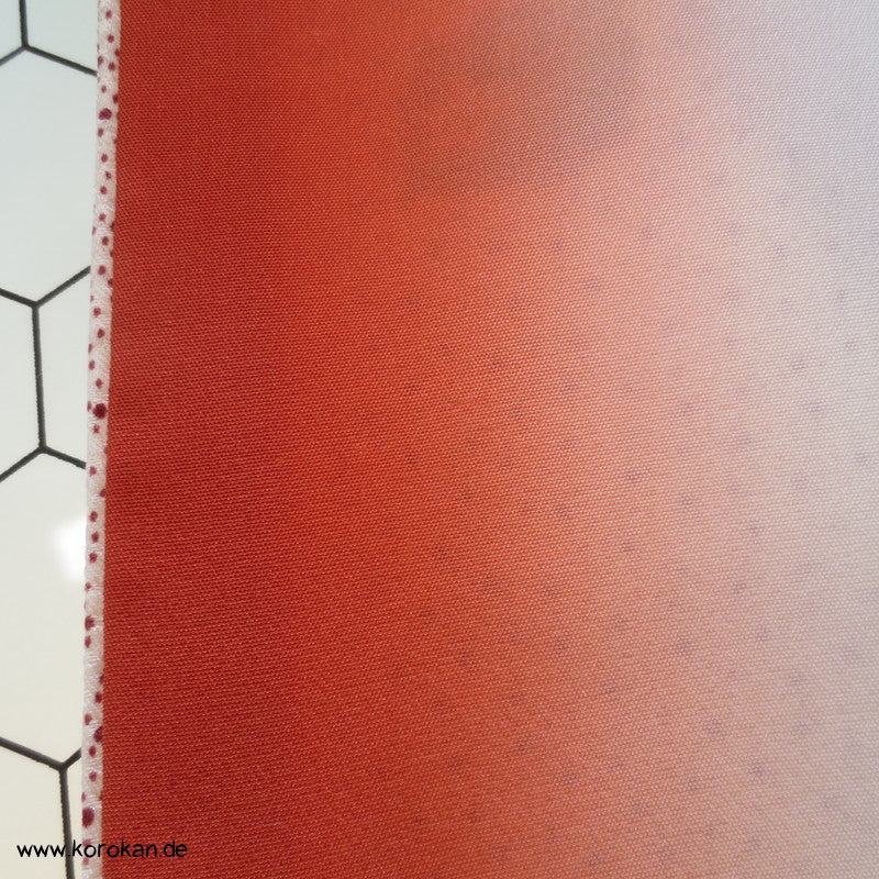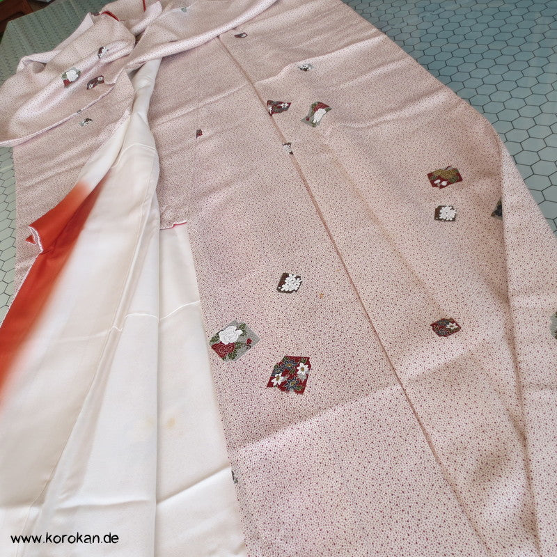 Vintage Komon Kimono Seidendamast mit allover MInipunkten auf denen unregelmäßige Blütenbilder prangen, oberen hellen Futter und unterem Hakkake mit Bokashi Farbverlauf.