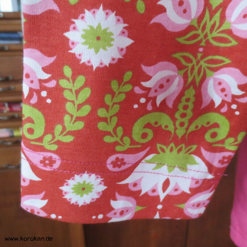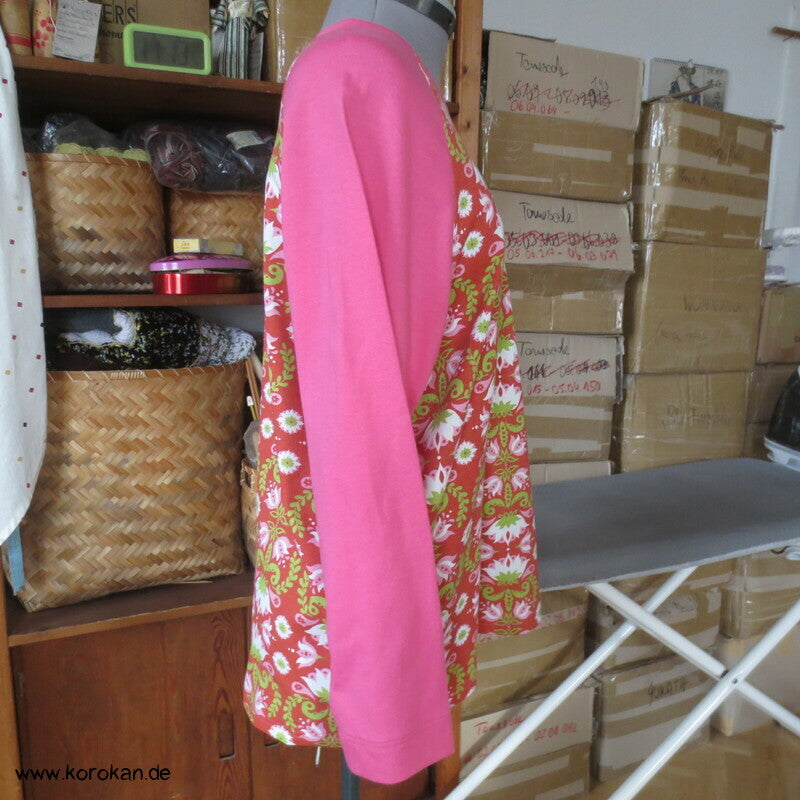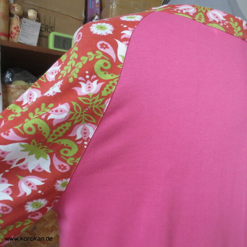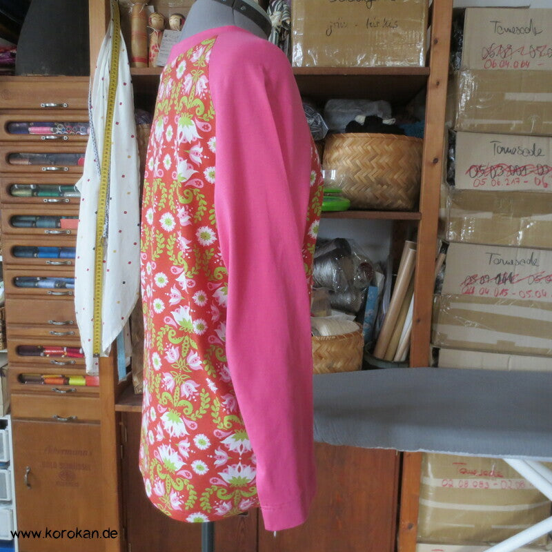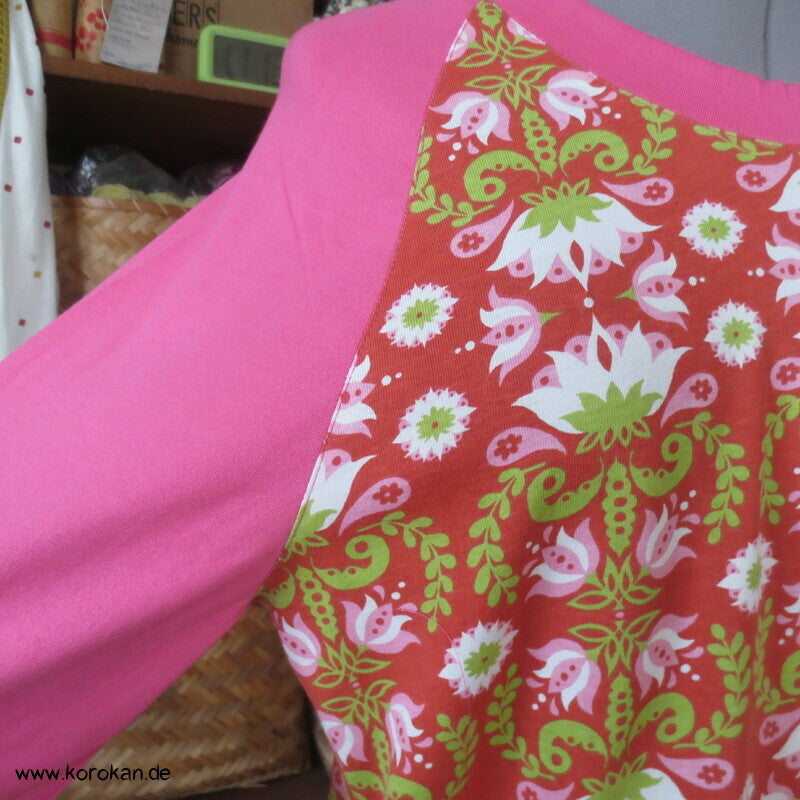 Raglanshirt aus gemustertem Öko Baumwolljersey, kombiniert mit uni pink SingleJersey, Baumwolle mit Elasthan