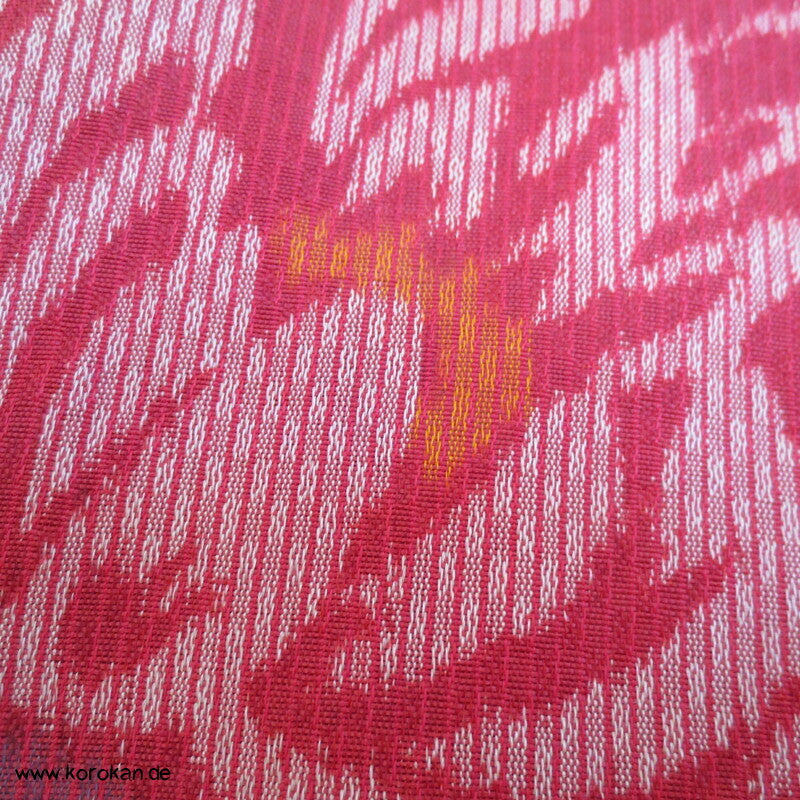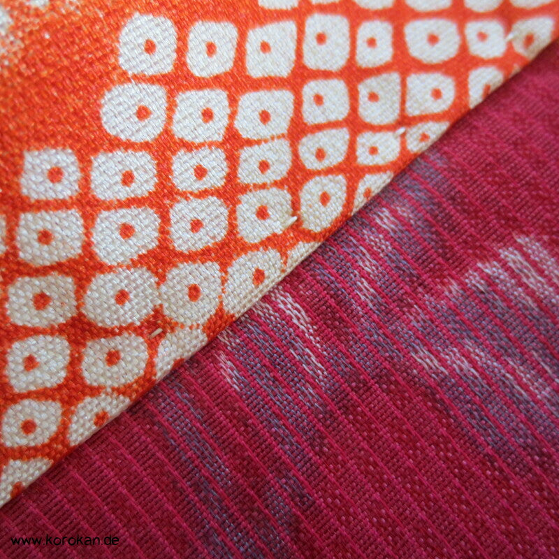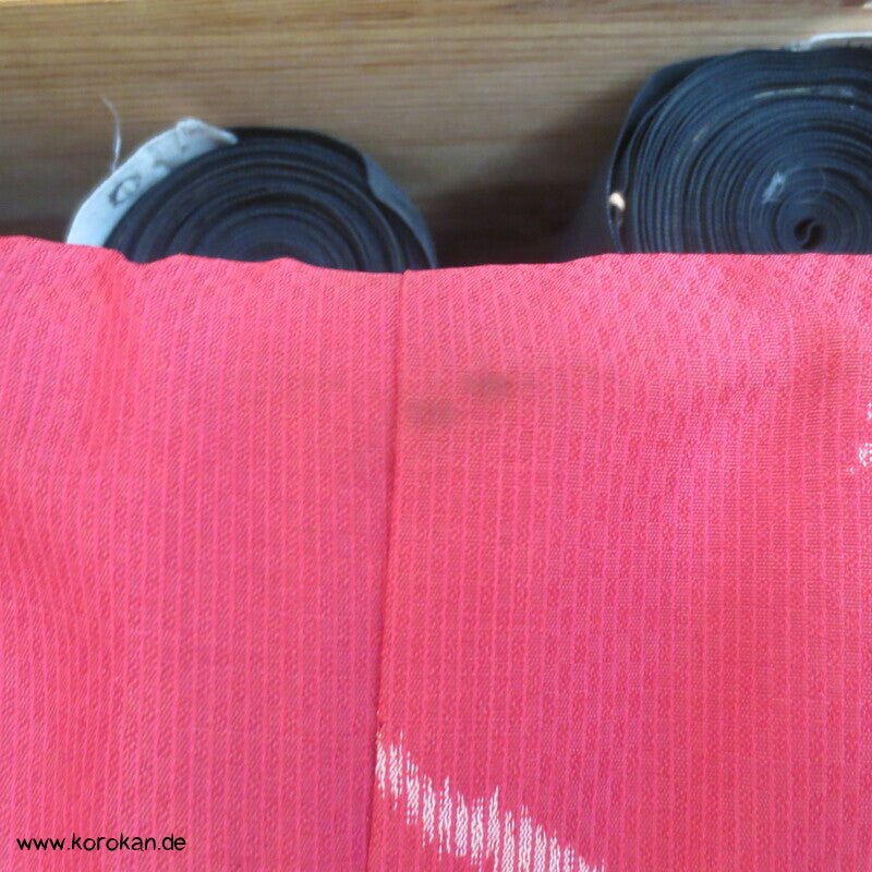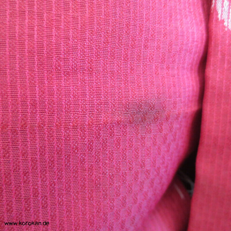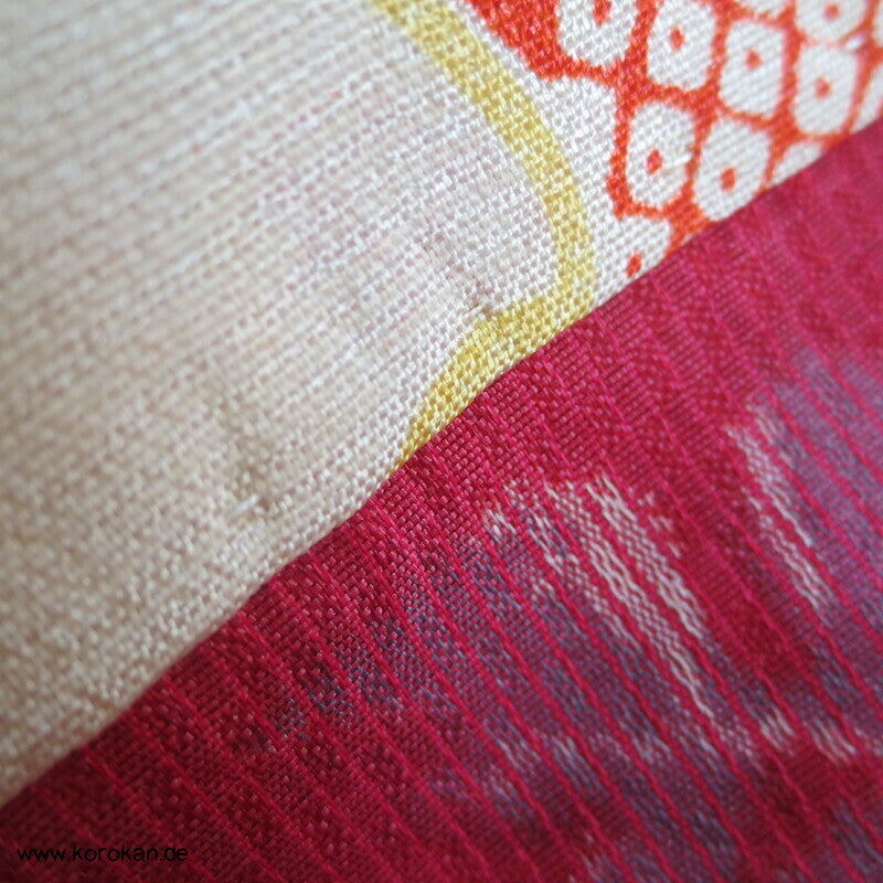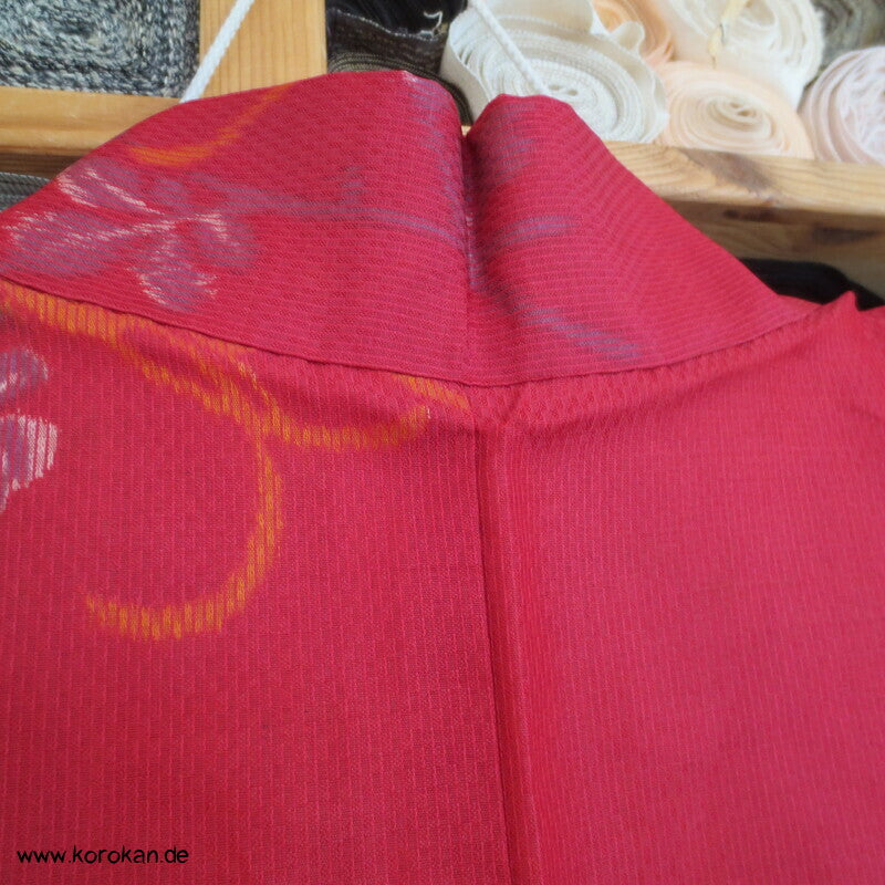 Vintage, fast schon antike Haori Kimono Jacke aus Seide / Rayon frühe Kunstseide Kasuri Meisen Strukturgewebt, Rangiku in weinrot mit buntem Futter.