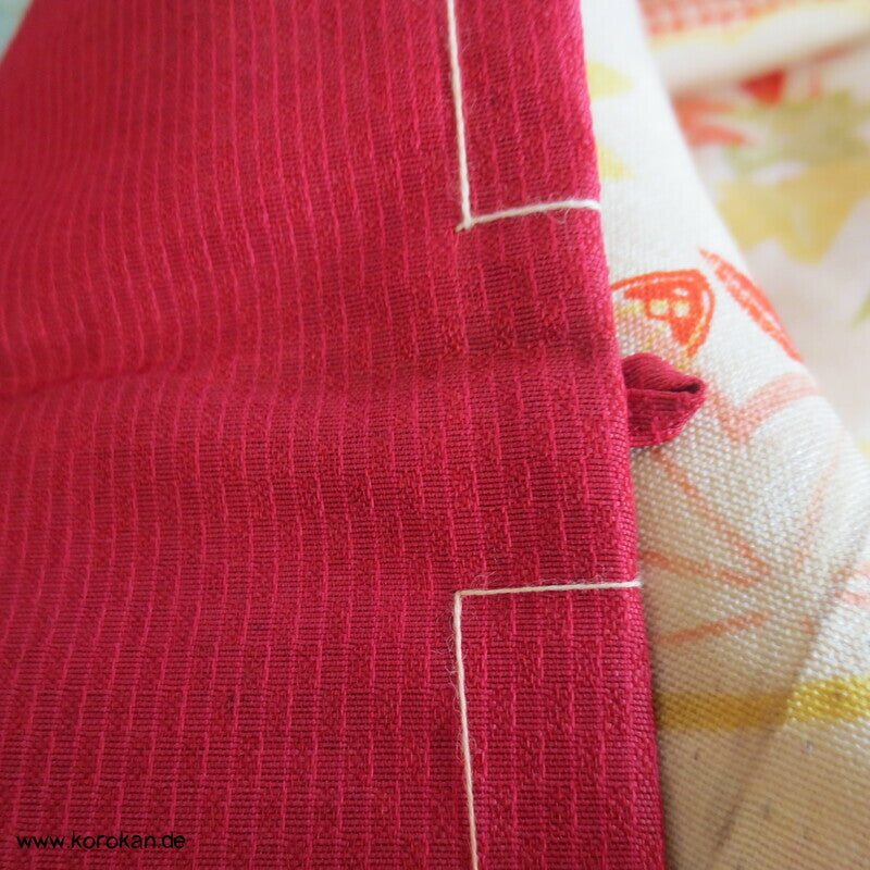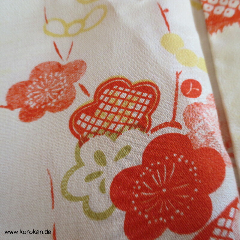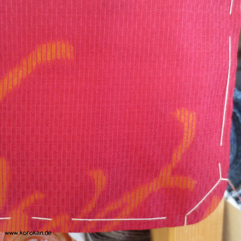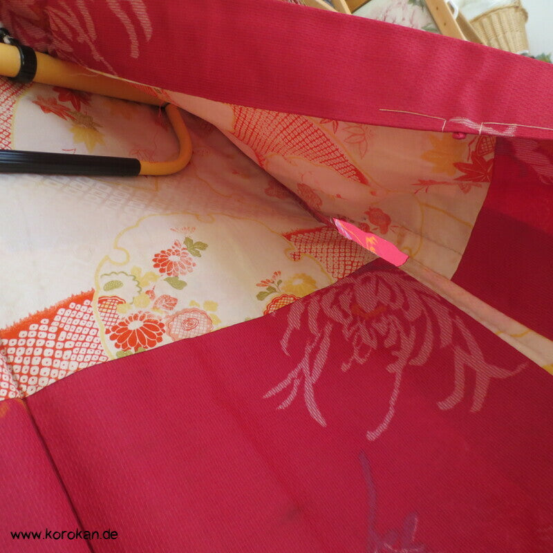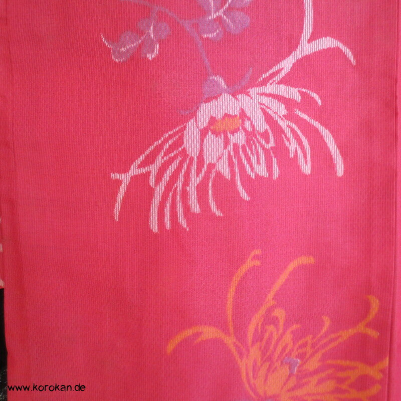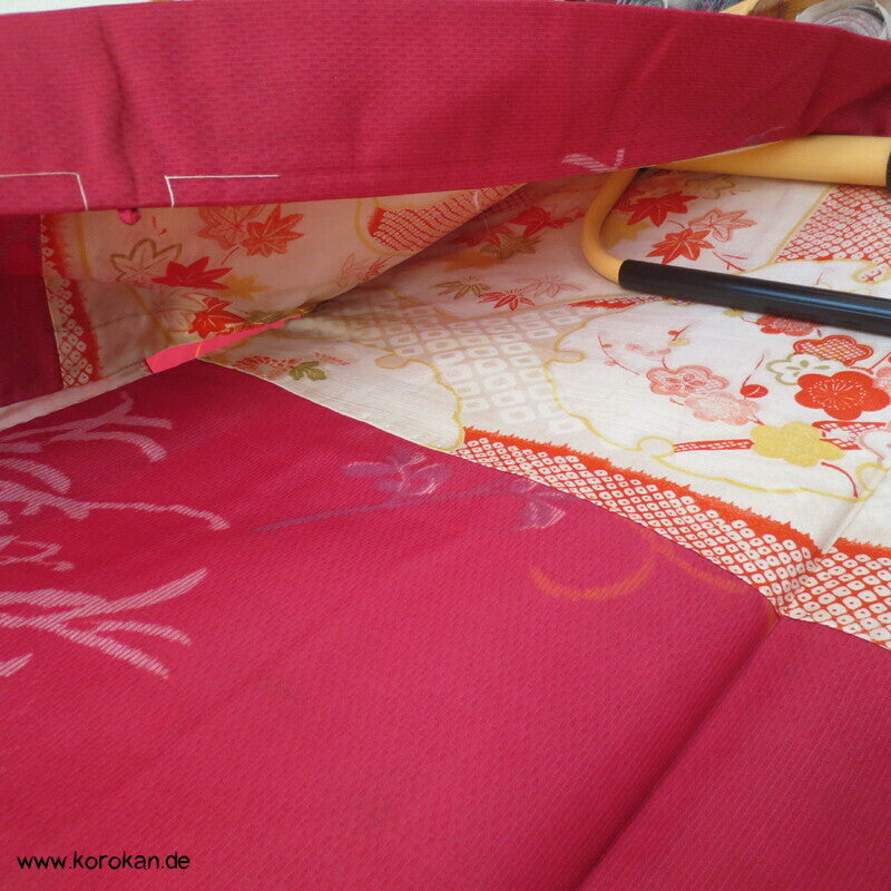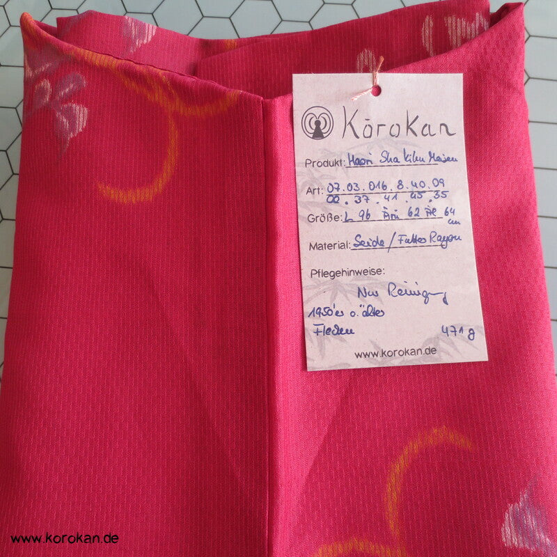 Vintage, fast schon antike Haori Kimono Jacke aus Seide / Rayon frühe Kunstseide Kasuri Meisen Strukturgewebt, Rangiku in weinrot mit buntem Futter.