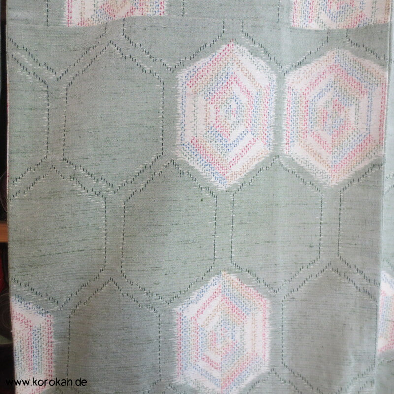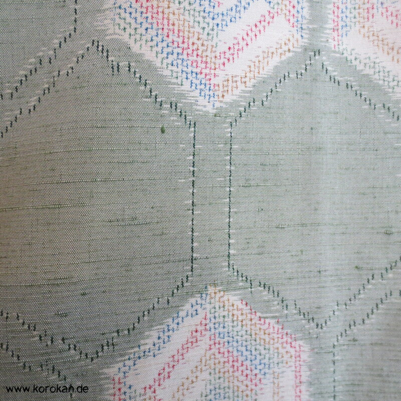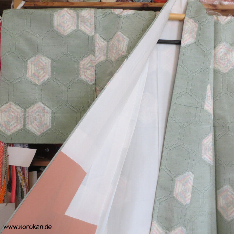 japanischer Vintage Tsumugi Seide Komon Kasuri bunte Kikko in jade, oberes Futter helle Seide, unteres Hakkake Futter Seide apricot