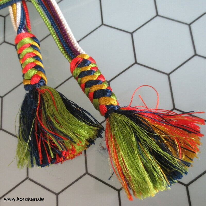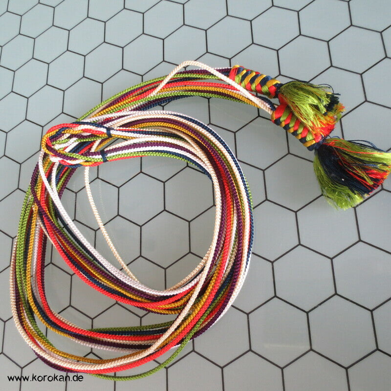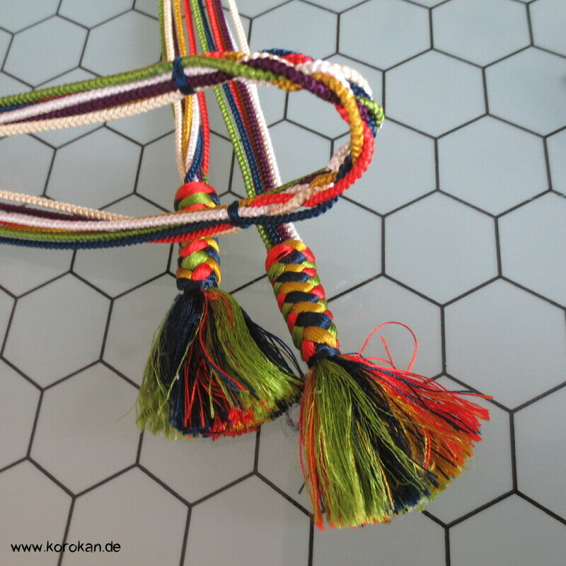 Vintage Seiden Kordel Obijime, bunte Schnüre verknüpft mit dickem Knoten über den Troddeln