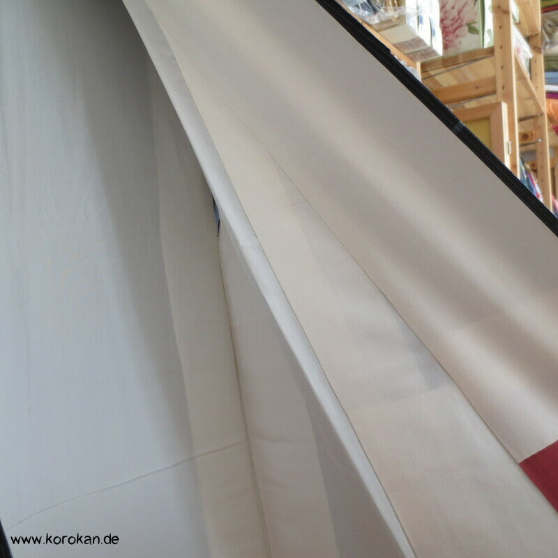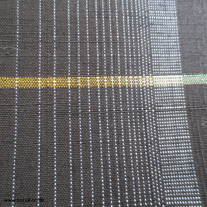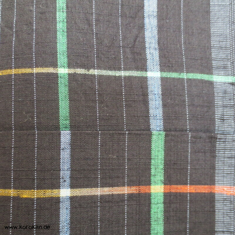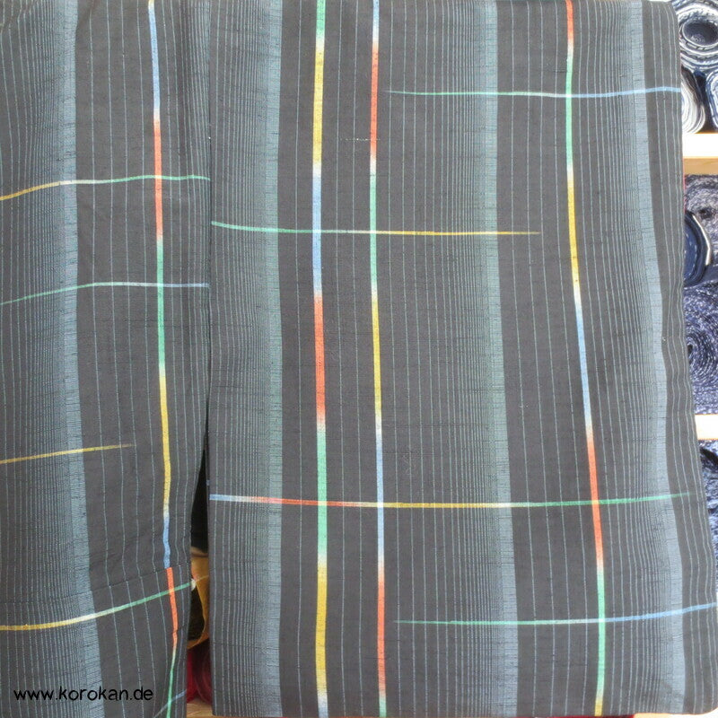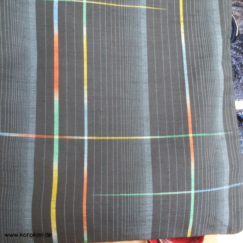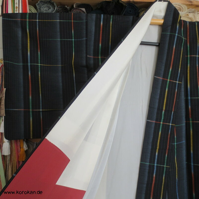 japanischer Vintage Tsumugi Seide Komon Kasuri Regenbogen Karo auf schwarz, oberes Futter helle Seide, unteres Hakkake Futter Seide rot