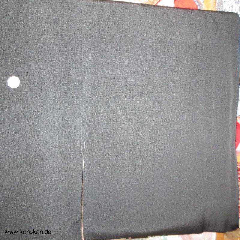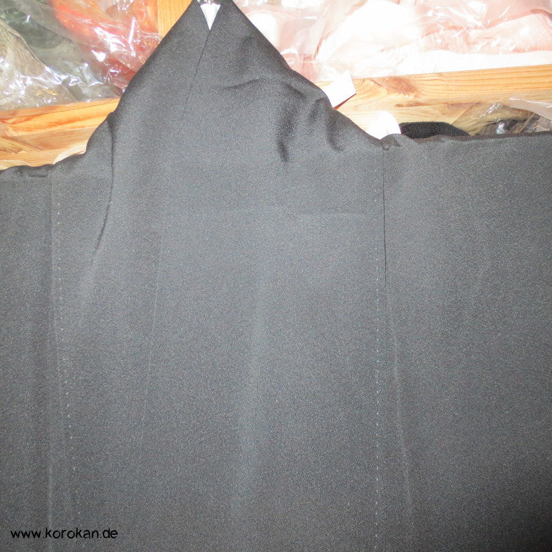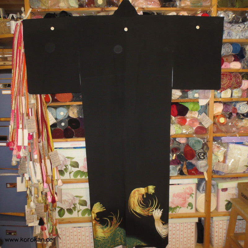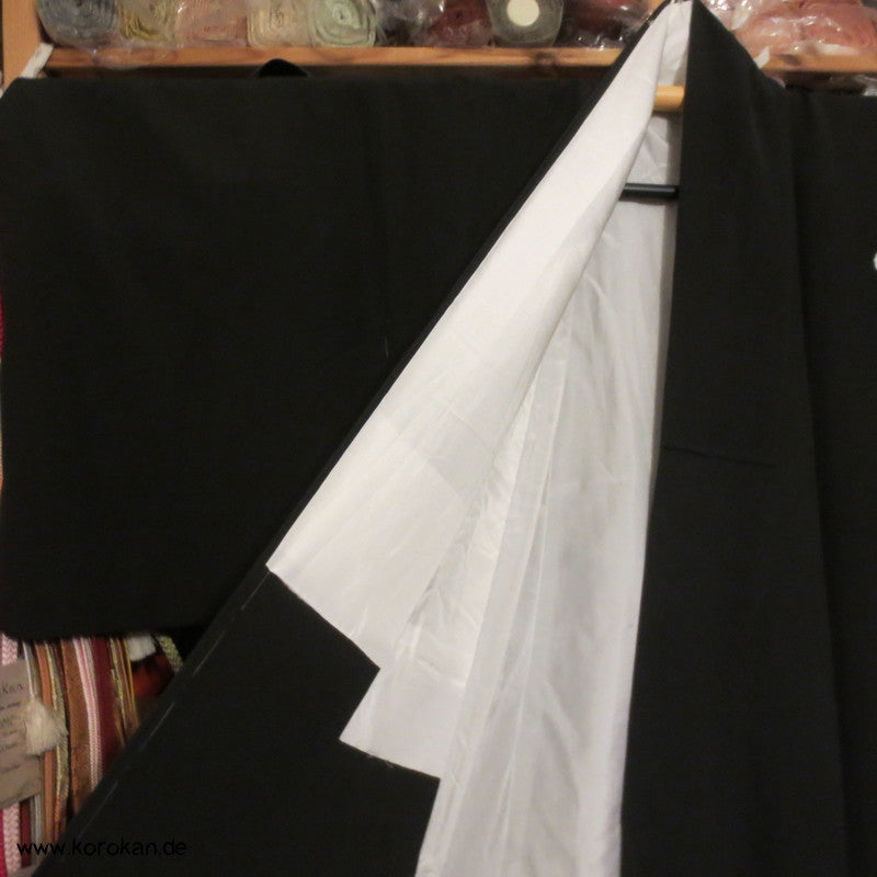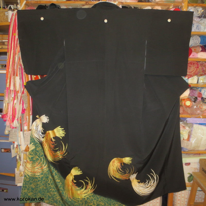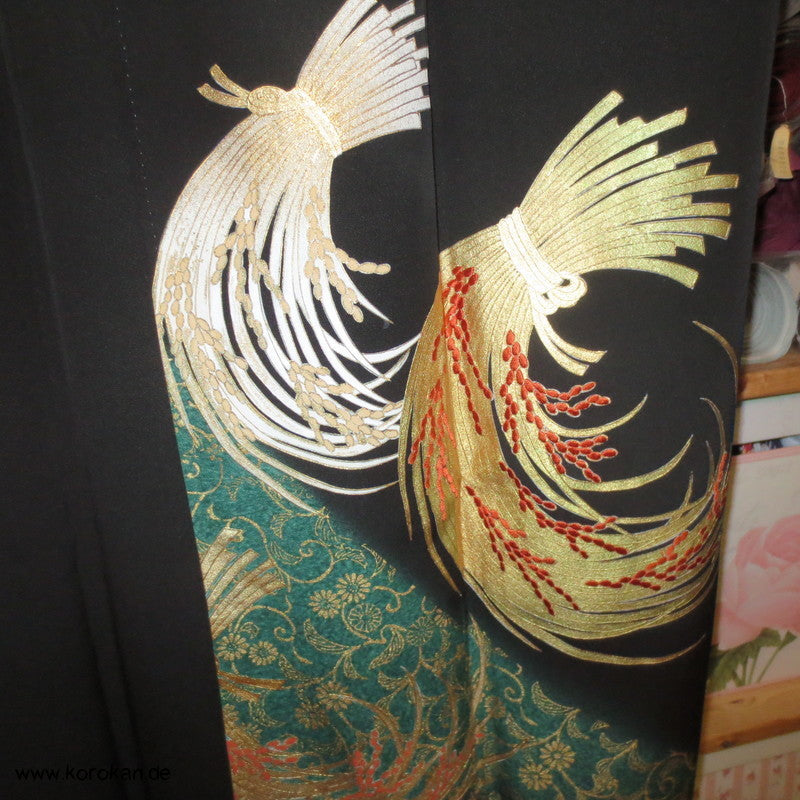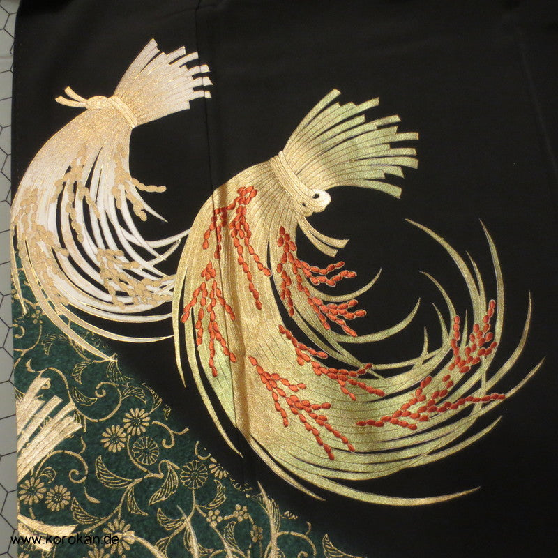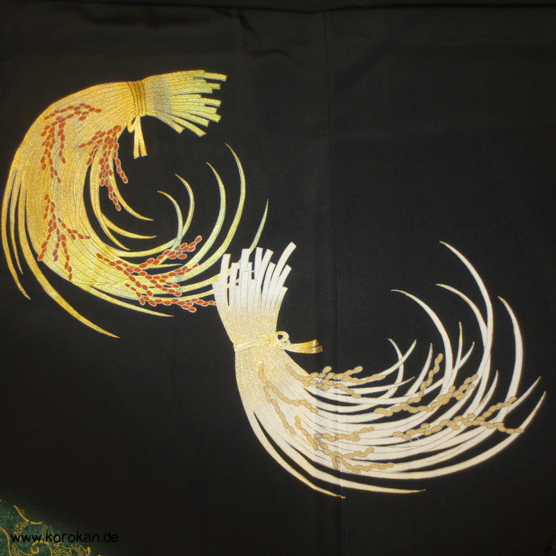 japanischer Vintage Tomesode formeller Kimono aus schwarzem Crepe, bemalt und bestickt mit Reisbündeln / Noshi, 5 Mon, oberes Futter helle Seide, unteres Futter aus Oberstoff mit Motiven.