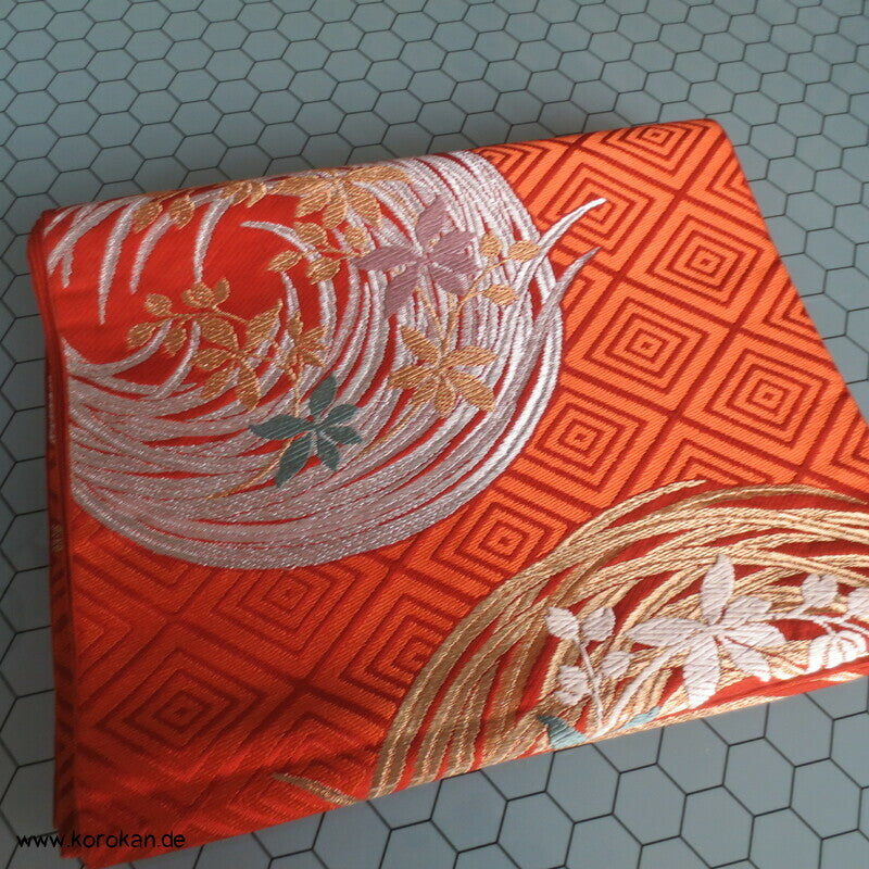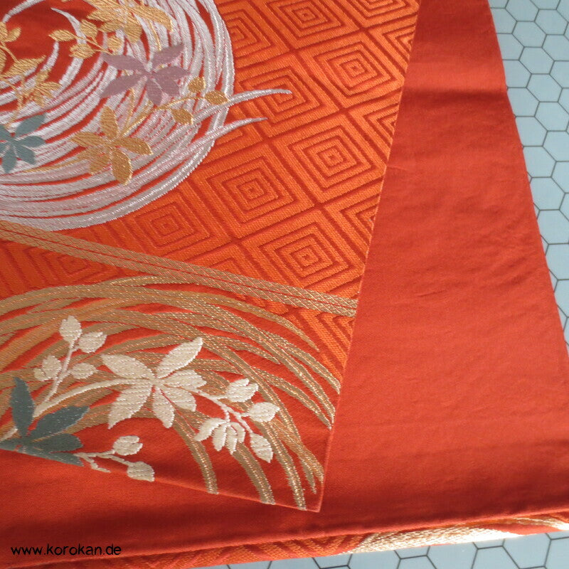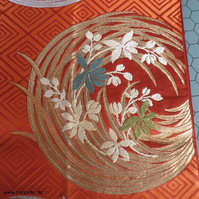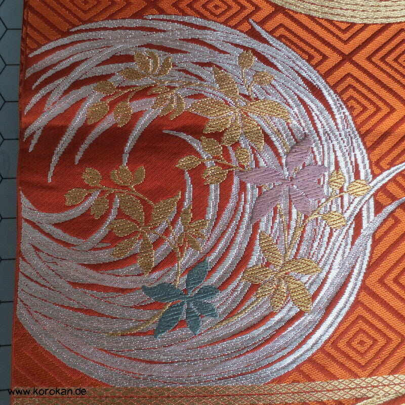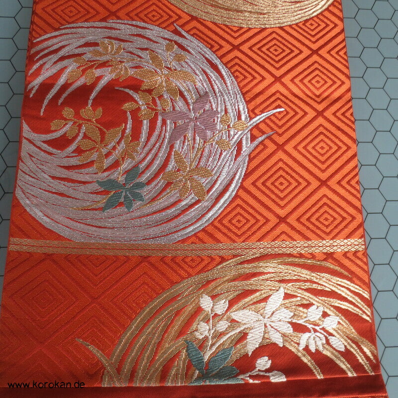 Reisgarbenrondelle auf persimmon Fukuro Obi Seidenbrokat Kimonogürtel