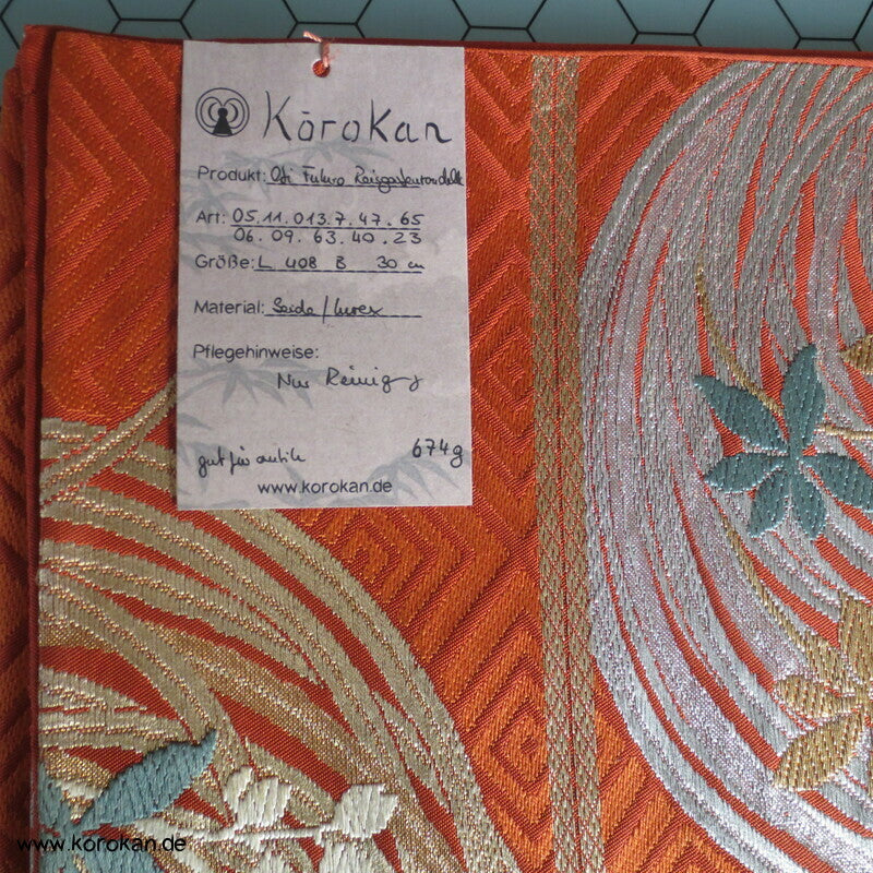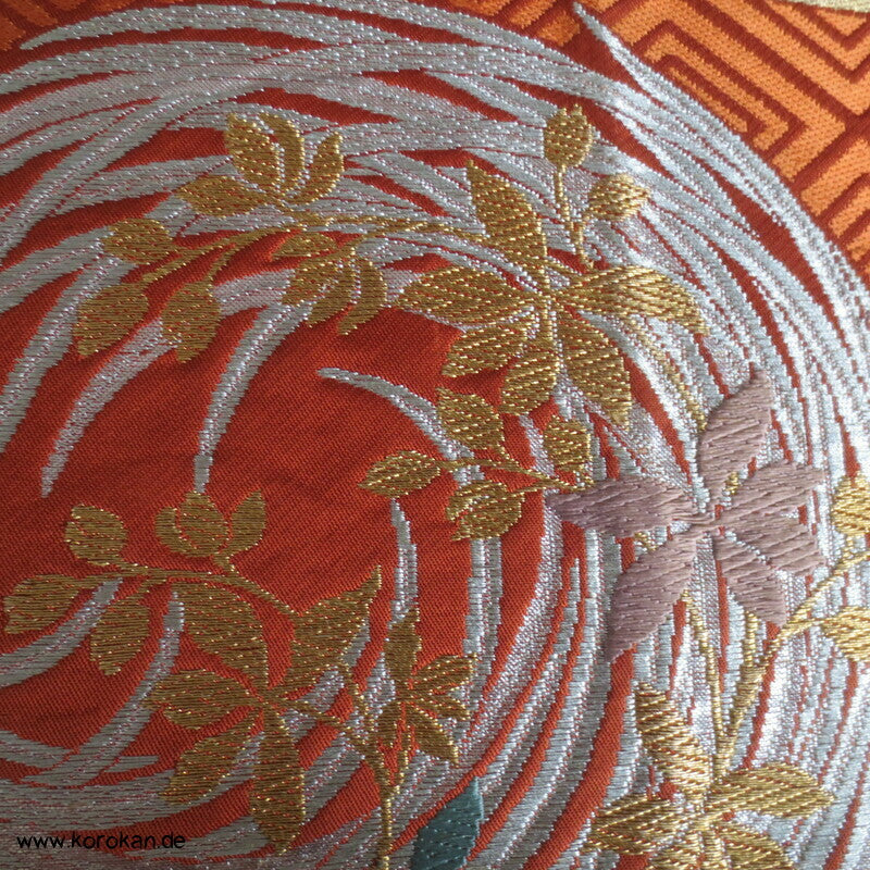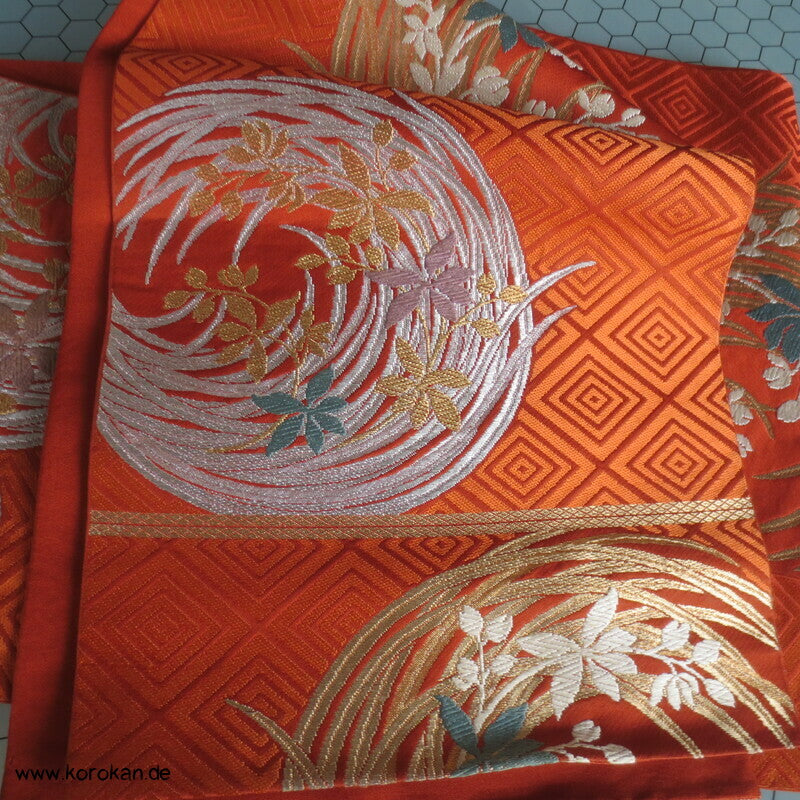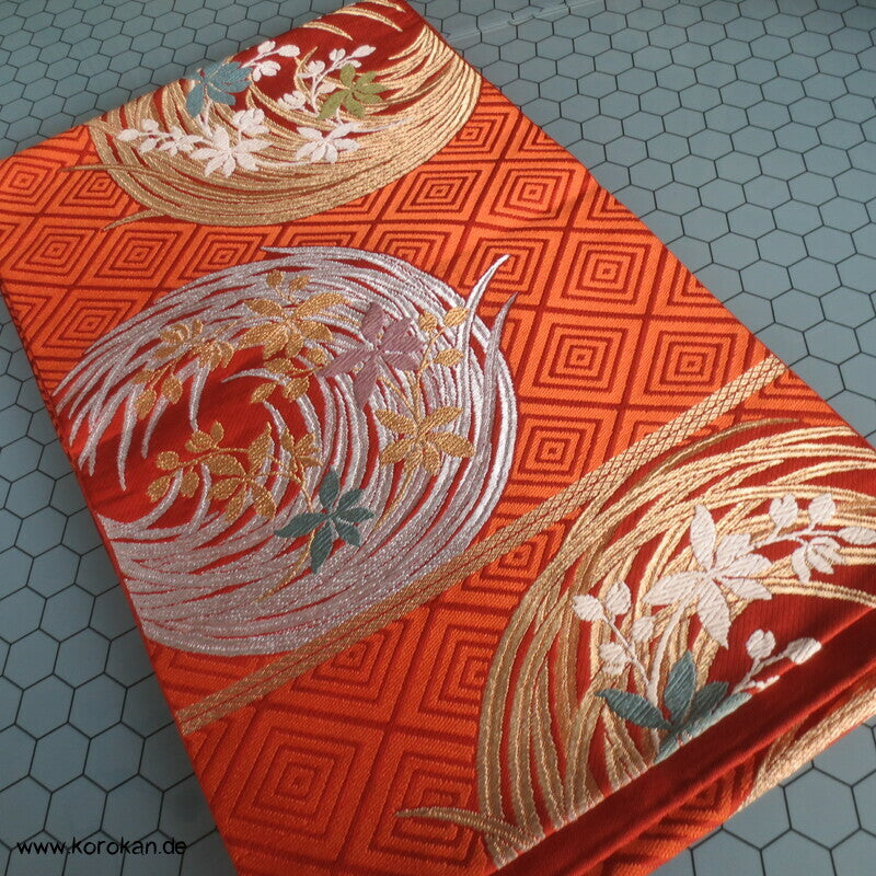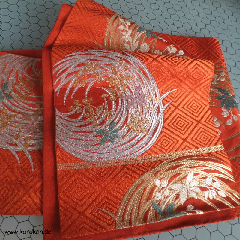 Reisgarbenrondelle auf persimmon Fukuro Obi Seidenbrokat Kimonogürtel
