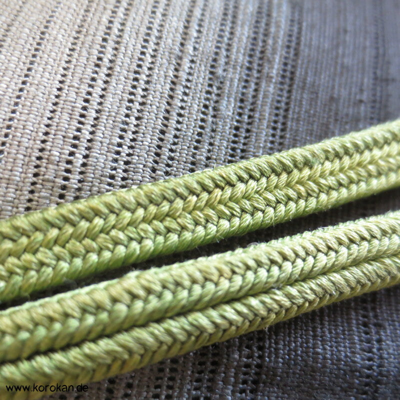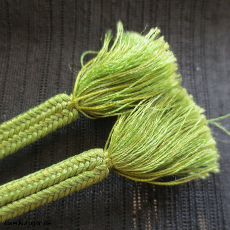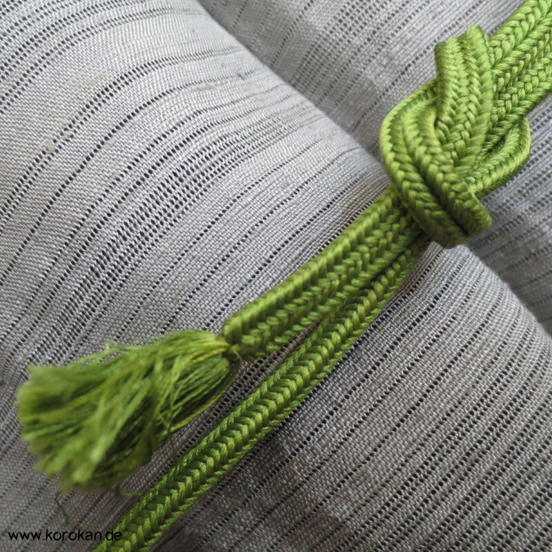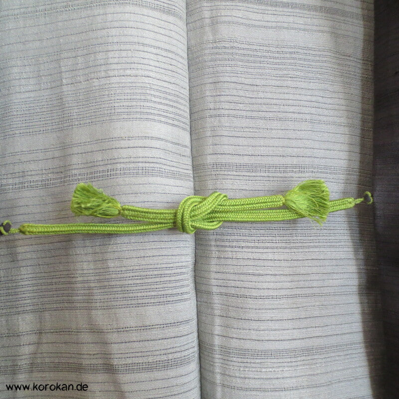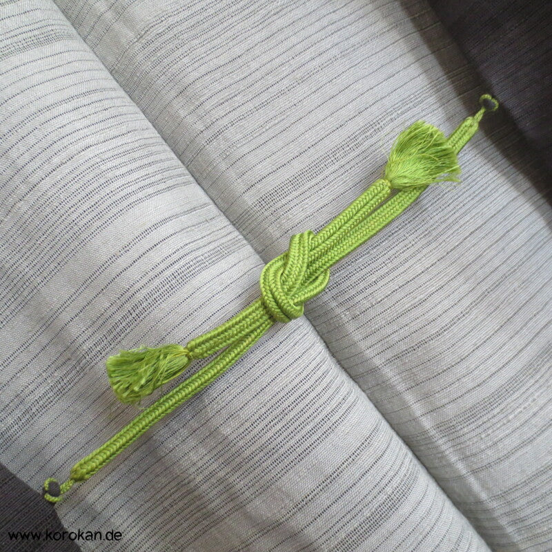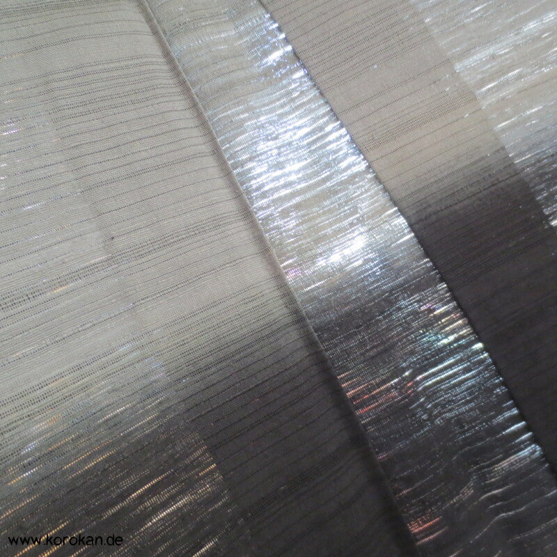 Vintage Haori Kimono Jacke aus feiner, schwarzer japanischer Rho gewebter Durchbruch Seide, zweilagig innen mit Farbverlauf von hellgrau nach antrazit und aussen schwarz, halbtransparent und grasgrünen Haori Himo Bindebändern.