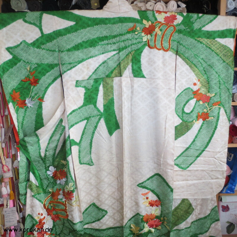 Riesen Noshi aus Shibori mit Stickereiblüten aus Seidendamast Furisode Kimono