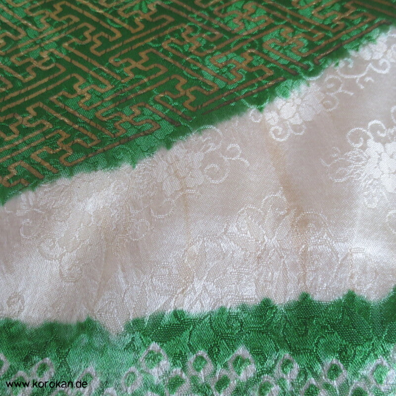 japanischer Vintage Furisode Kimono Diamantrauten Seidendamast riesige grüne Shibori Noshi bündel mit gestickten Blumen auf hellem Grund, Goldauflage, viel Stickerei Goldfäden