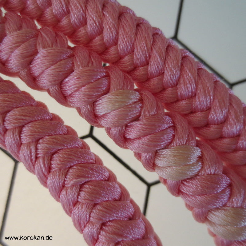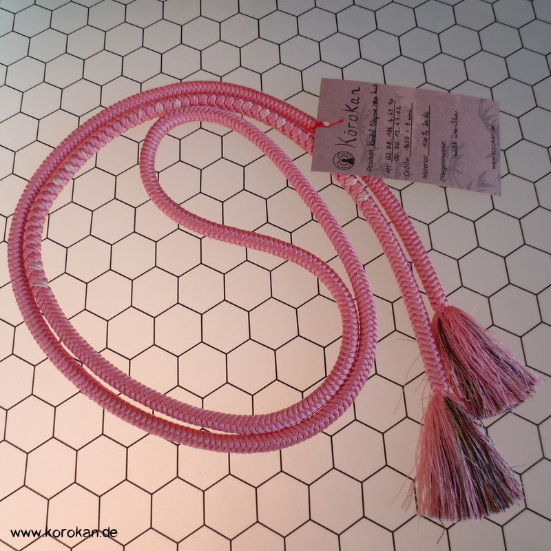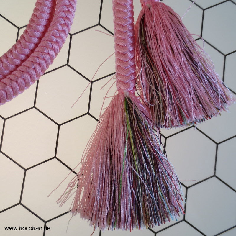 Vintage Seiden Kordel Obijime, geflochten rosa mit unterschiedlichen Strukturen, mit bunten Troddeln