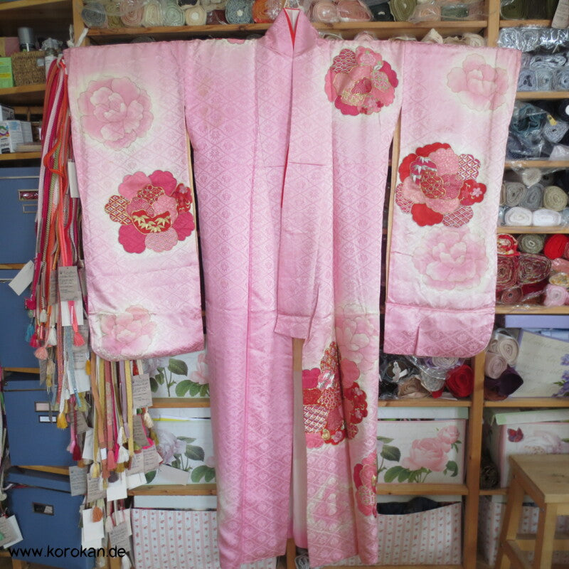 Vintage Furisode Higaki Seidendamast mit großen Blüten mit Motiven, oberes Futter helle Seide, unteres Hakkake aus Seidencrepe mit rosa Bokashi Verlaufsrand.