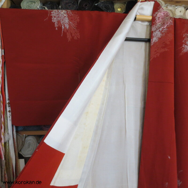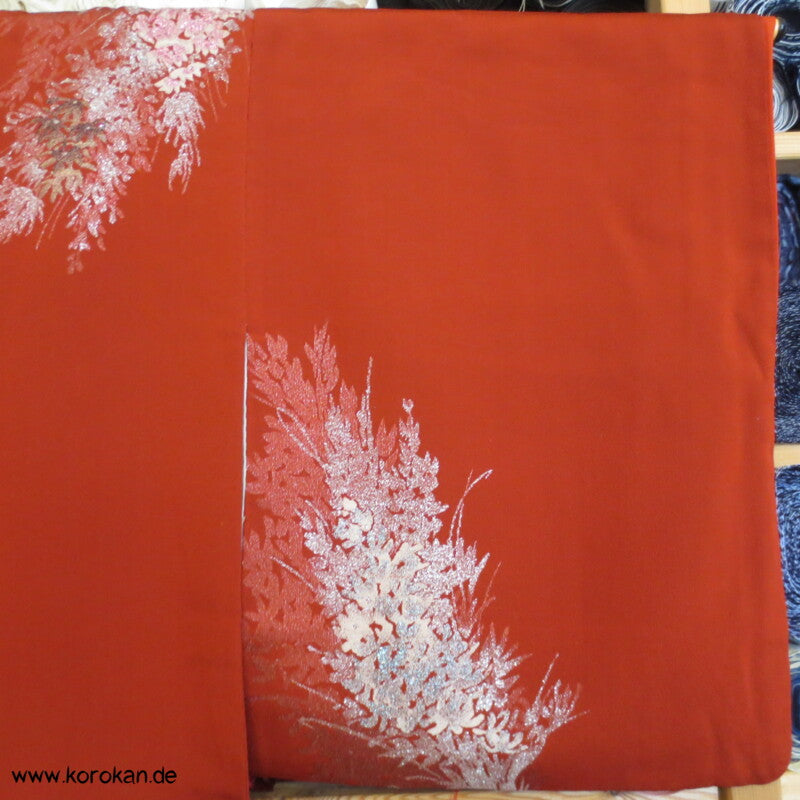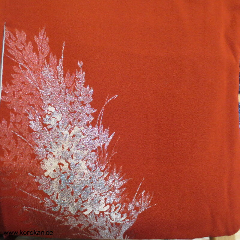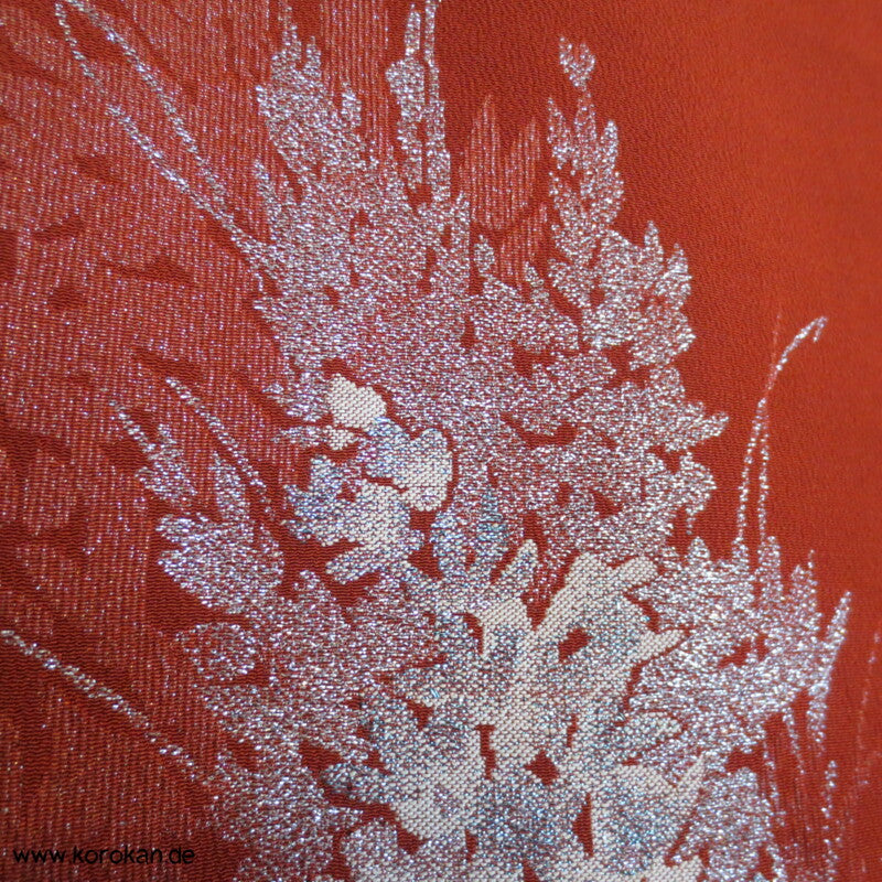 Vintage, japanischer 1950'er, eher antiker Komon Kimono Seiden Jacquard mit eingewebten silber Urushi Blütenwedeln in rostrot, oberen hellen zarten handgewebtem Seiden Futter und unterem Hakkake Futter Seidencrepe rostrot