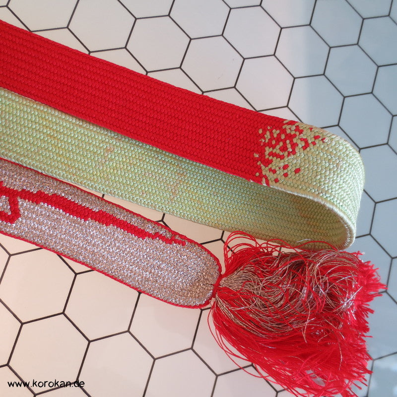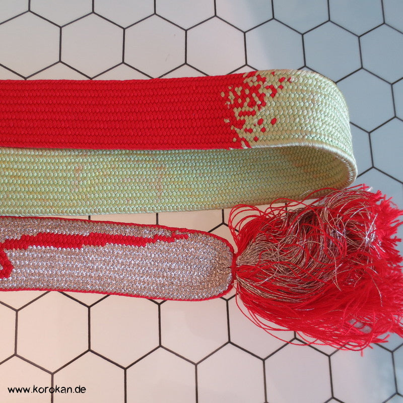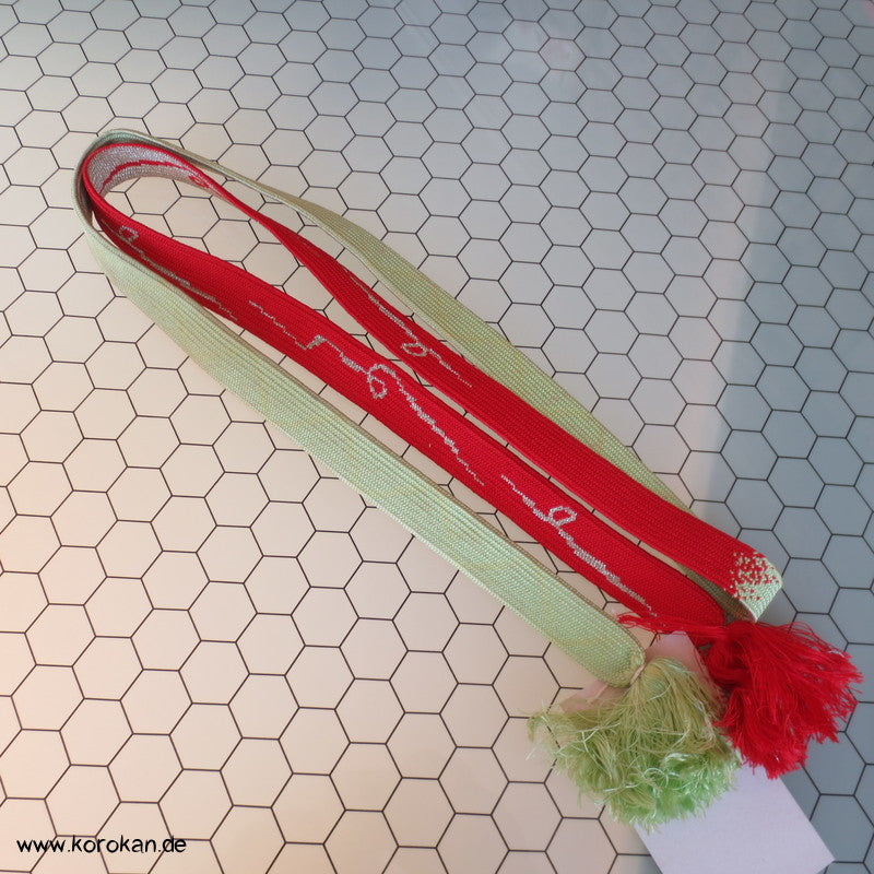 flacher Obijime mit Farbverlauf in rot seladon silber mit Band in wechselseitiger Flechtung.