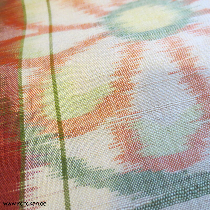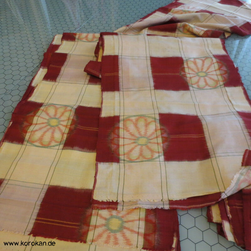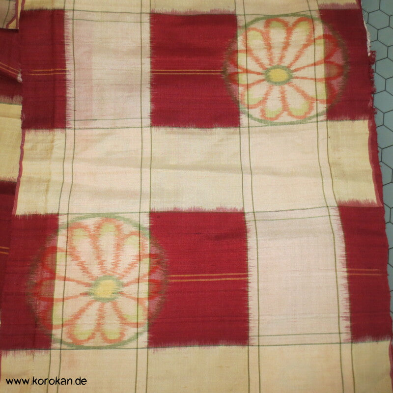 Japan Art Deco 1920'er Vintage Araihari Meisen / Kasuri Seiden Kimono Stoff aus einem aufgetrennten Kimono mit abstrakten Kiku auf Karo