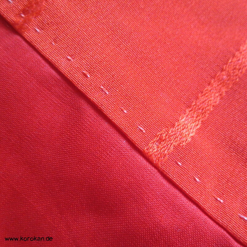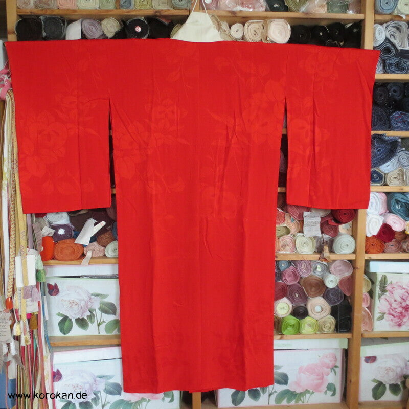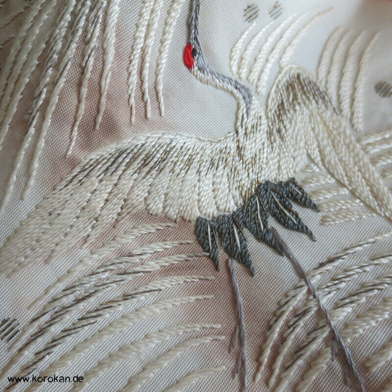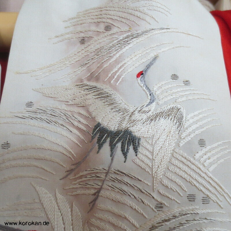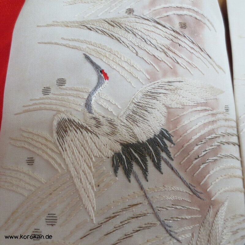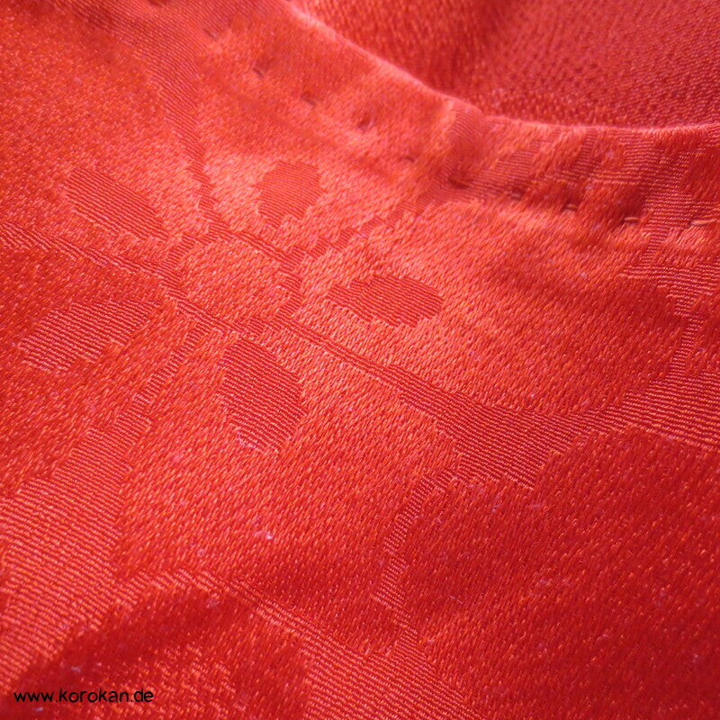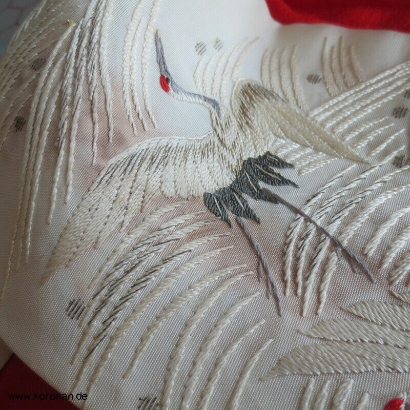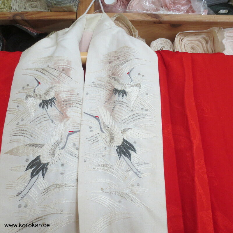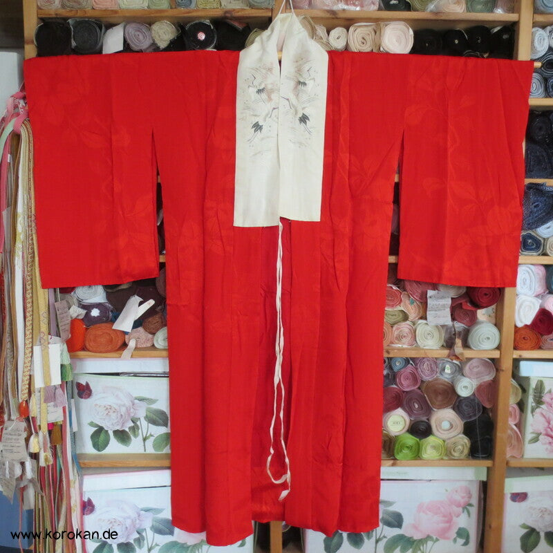 rote Rinzu Damast Seide Juban Unterkimono, Kranich bestickter Kragen