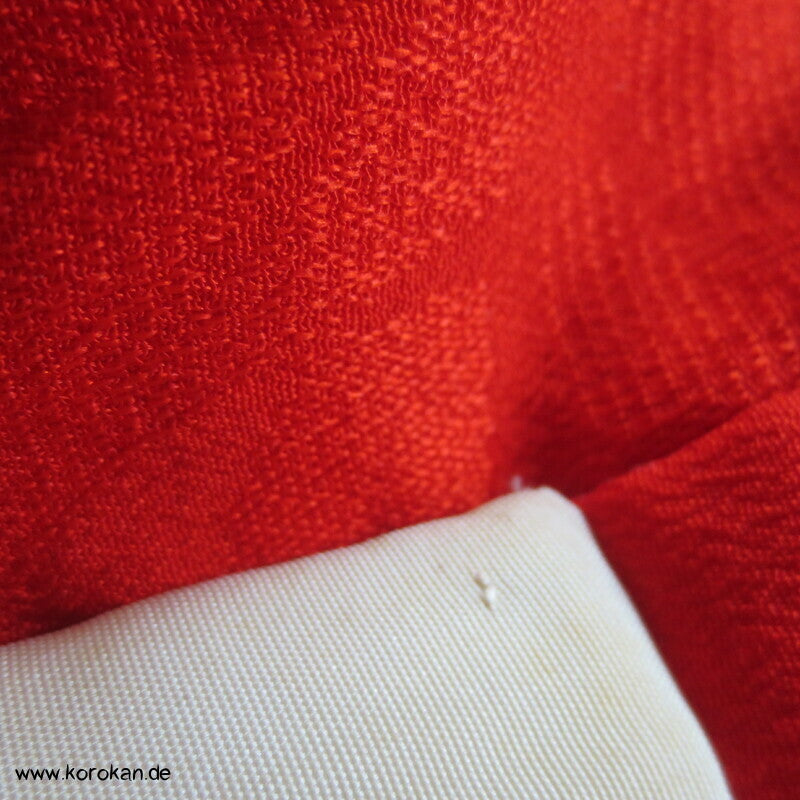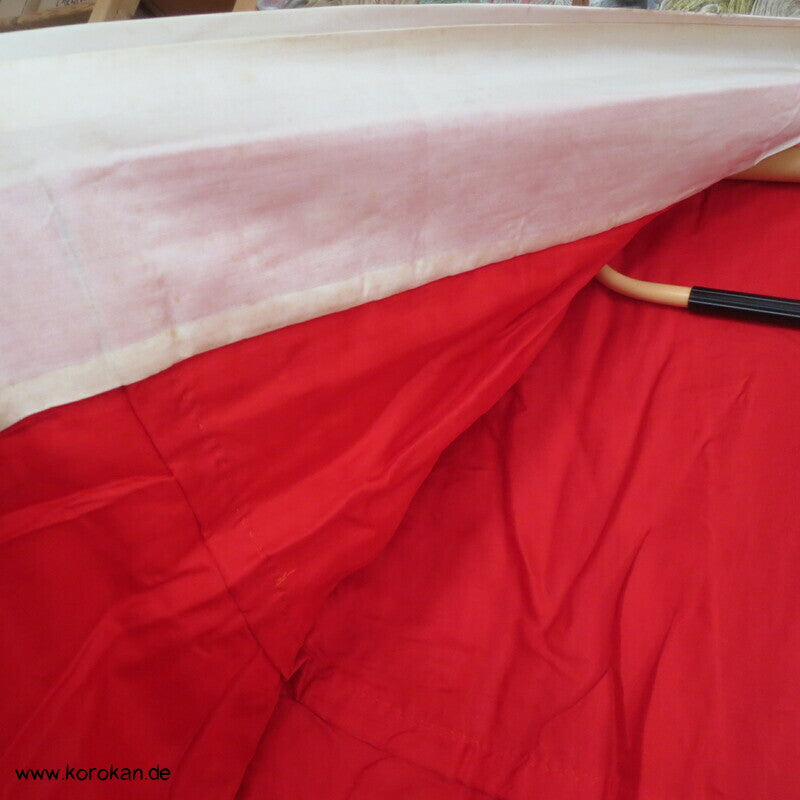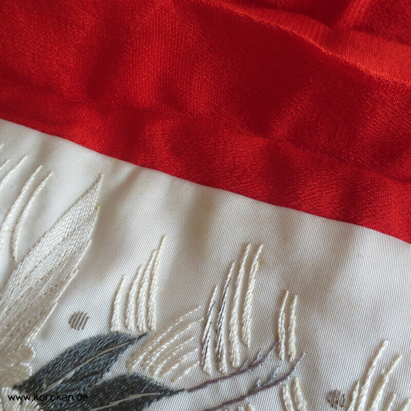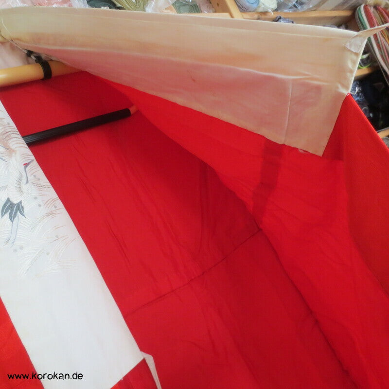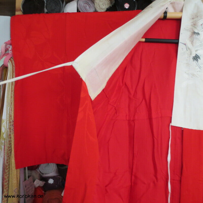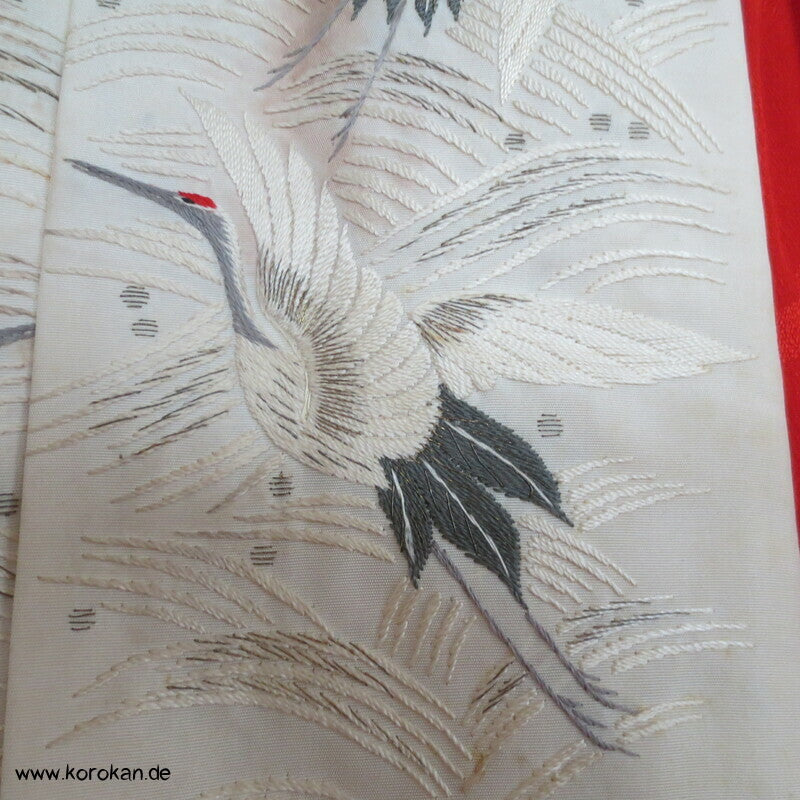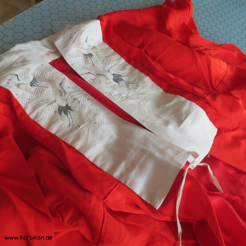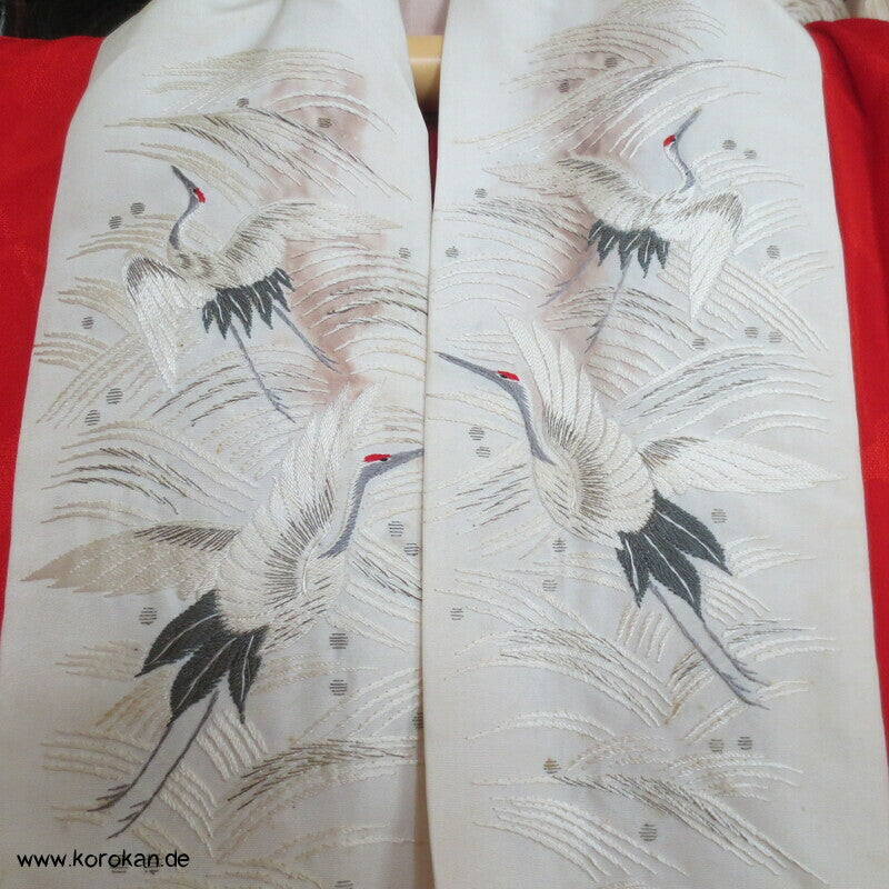 antiker Juban Unter Kimono rote hauchdünne Damast Seide, mit rotem Seidenfutter, mit Kranichen bestickter Han Eri,