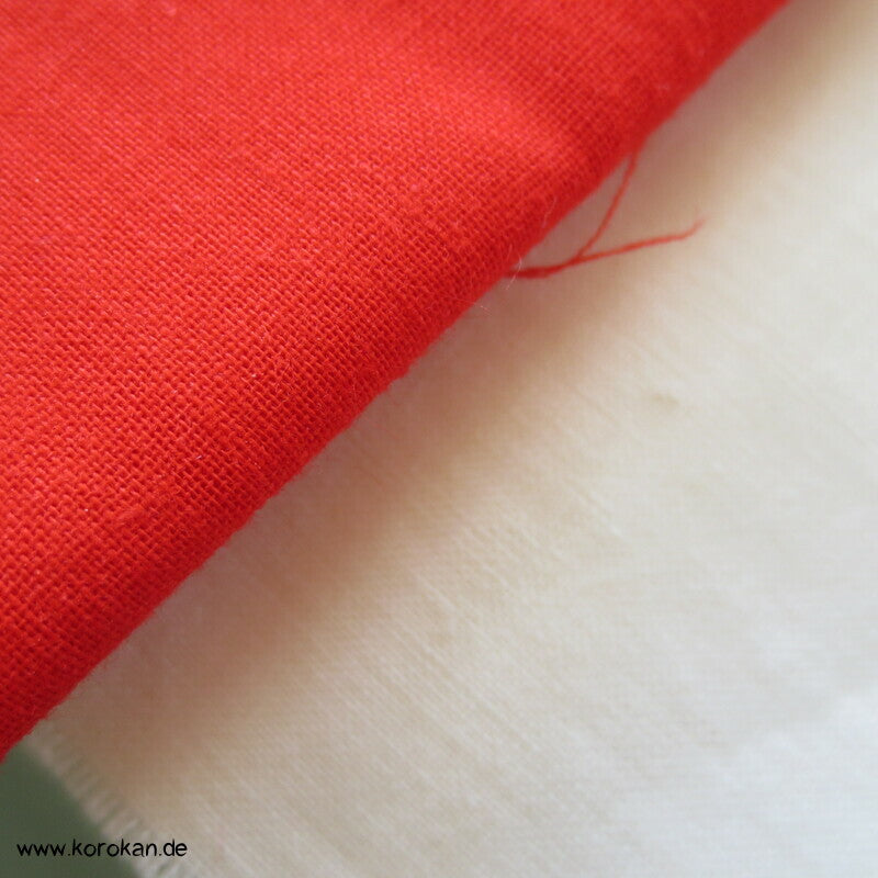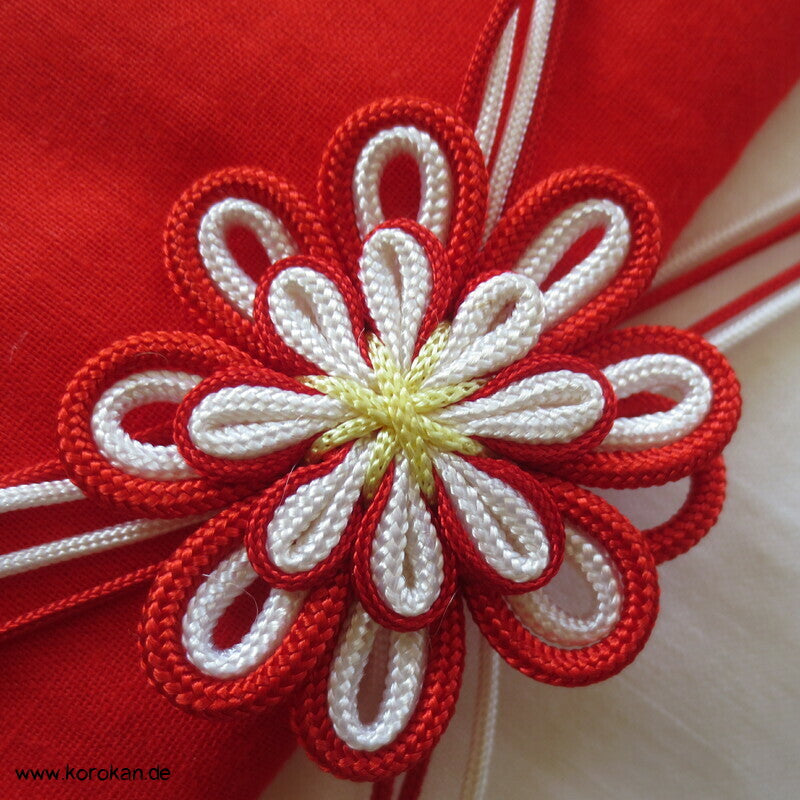 Vintage unbenutzter Baumwoll Kimono Futterstoff in rot und weiß, gehefetet mit Kanzashi Blüte